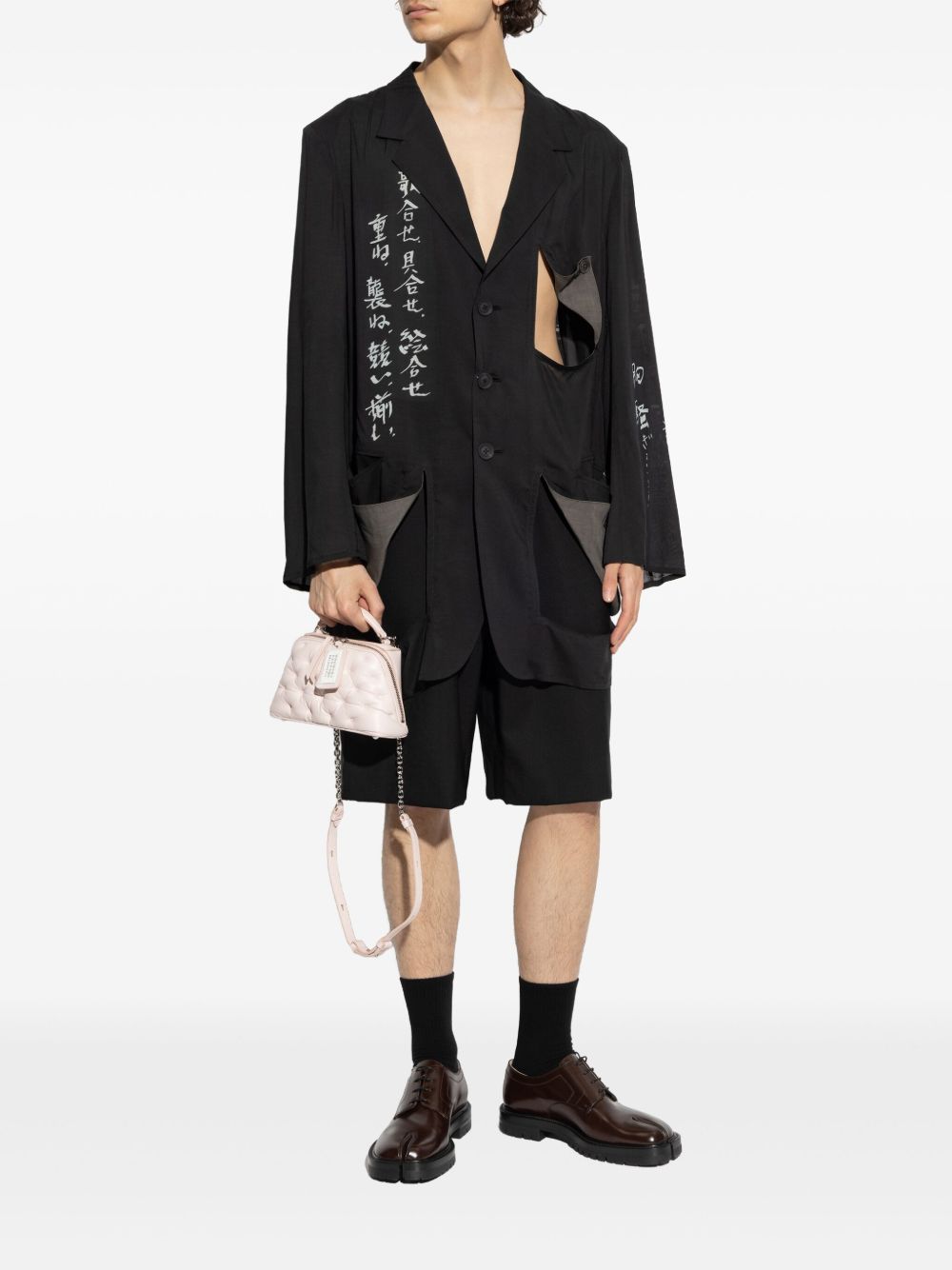This black blazer features a sleek front button fastening and classic notched lapels, offering a refined silhouette. Designed with long sleeves for a polished look, it stands out with a distinctive graphic print on the rear, adding a modern edge to a timeless piece. Ideal for elevating professional or smart-casual outfits with subtle statement detail.