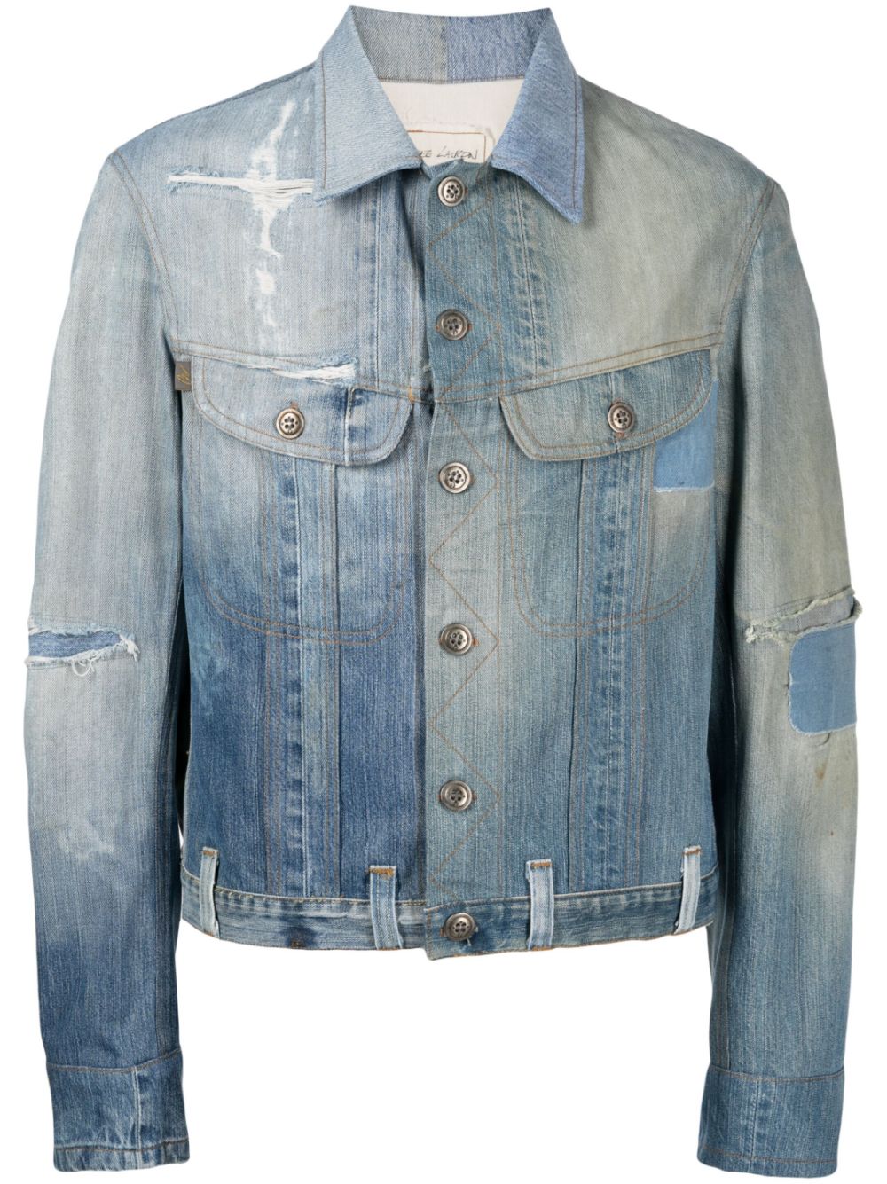 distressed-effect denim jacket from GREG LAUREN featuring blue, cotton, washed denim, distressed effect, classic collar, front button fastening, long sleeves, buttoned cuffs and two button-fastening chest pockets.
