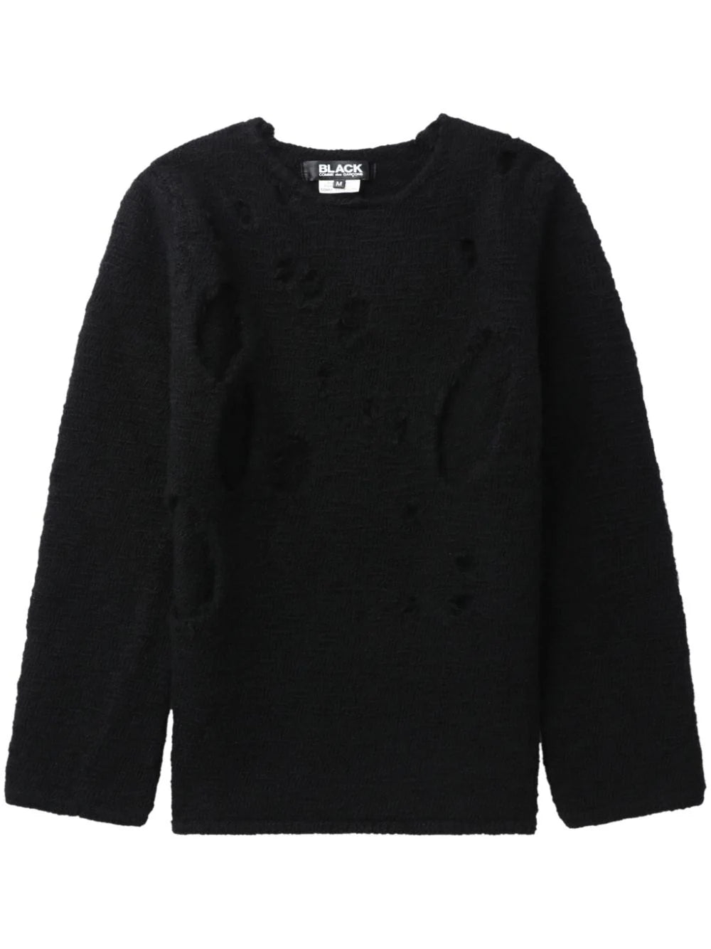 distressed-effect wool jumper from BLACK COMME DES GARÇONS featuring black, wool, distressed effect, ribbed trim, crew neck, long sleeves and straight hem.