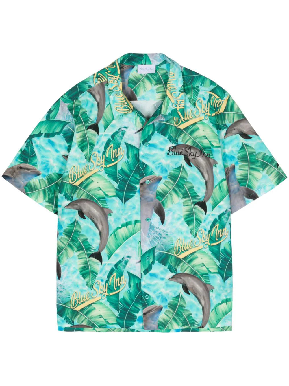 aqua green cotton all-over graphic print classic collar front button fastening short sleeves straight hem