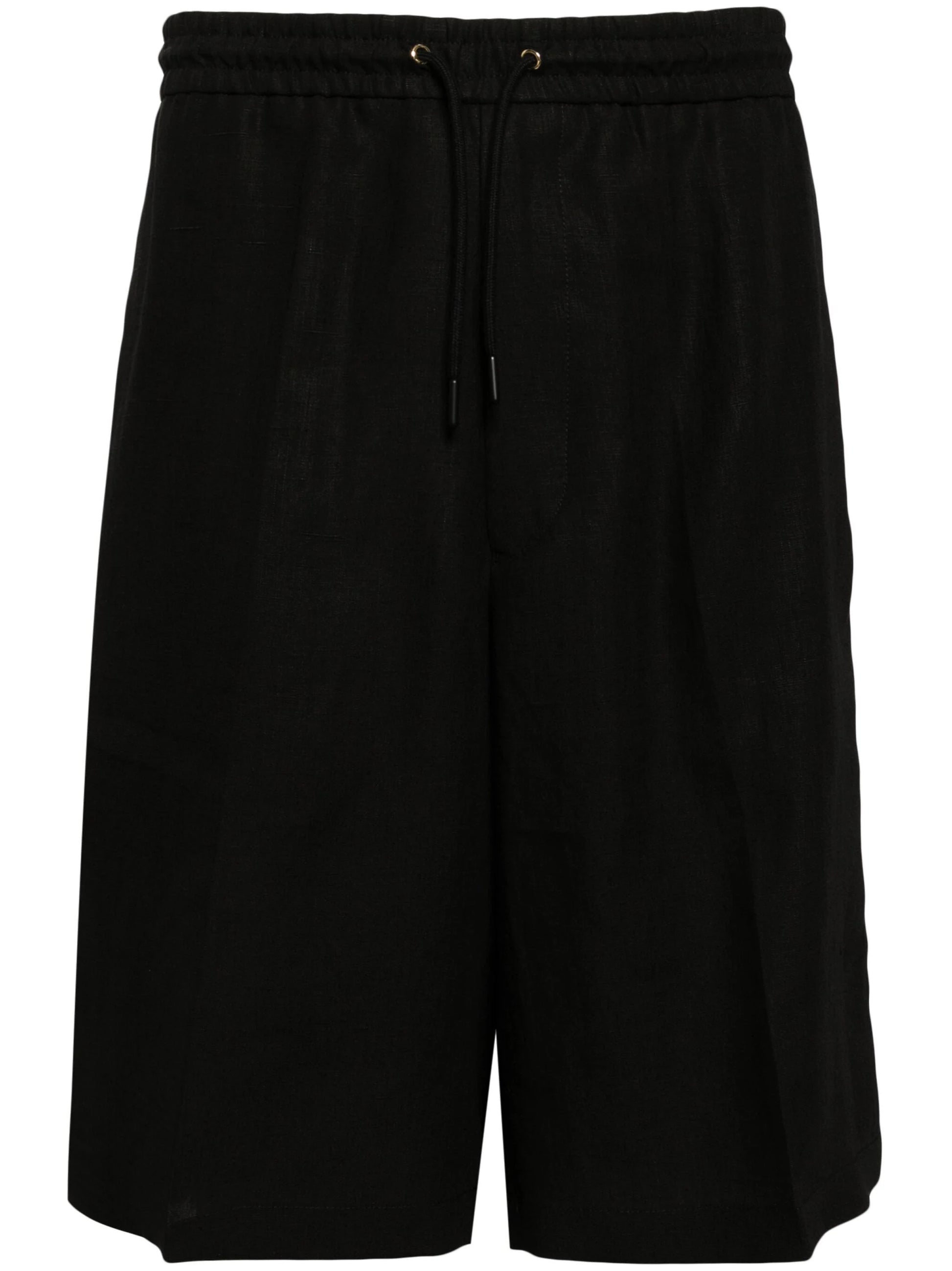 black linen/flax pleat detailing mid-rise elasticated drawstring waistband straight leg two side slit pockets rear jetted pocket knee-length