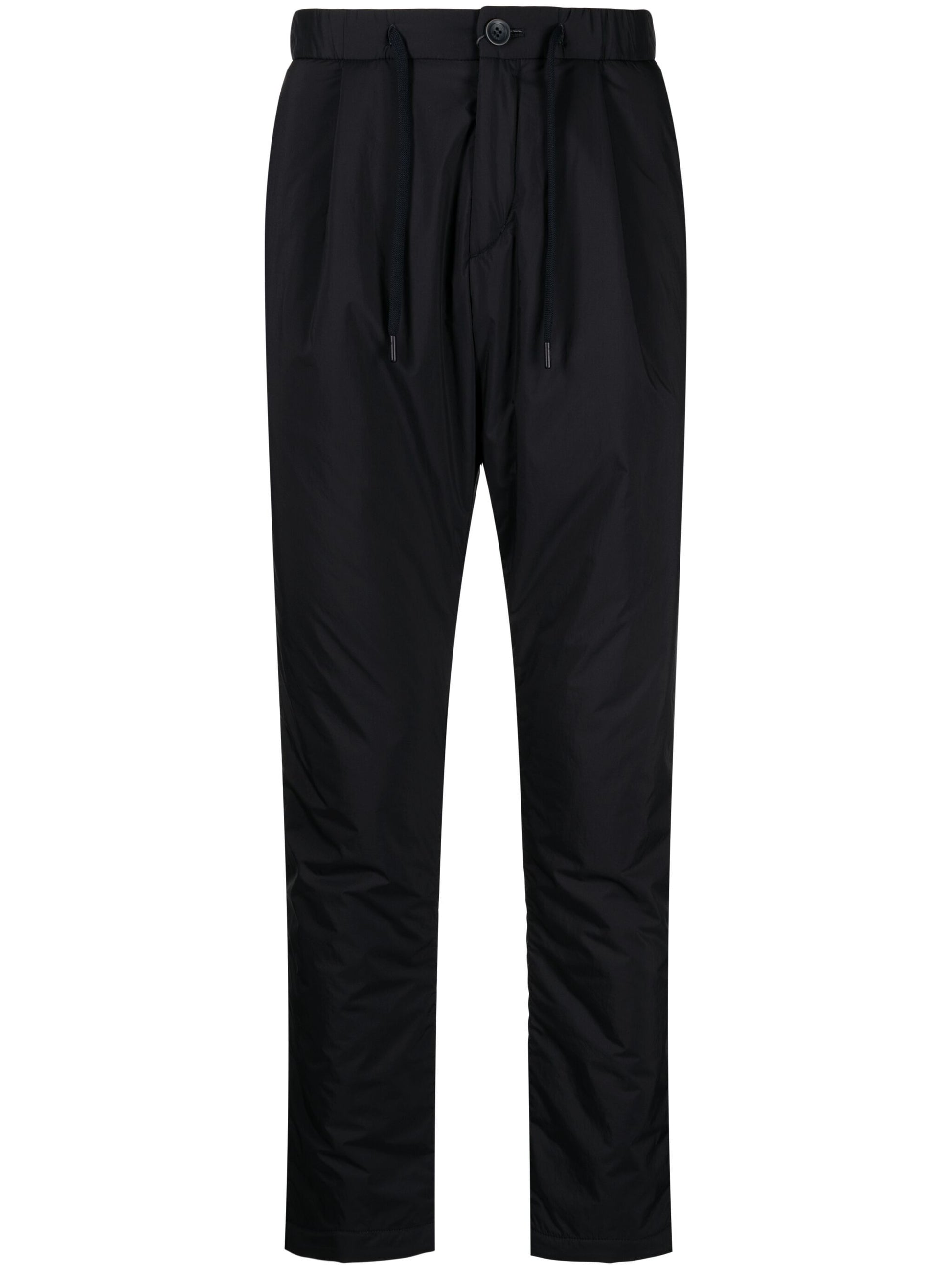 Expertly designed for both style and comfort, our Elasticated-Waist Tapered Trousers feature a navy blue tone with tonal stitching and pleat detailing. The elasticated drawstring waistband and front button fastening ensure a perfect fit, while the tapered leg and two side slash pockets add functionality and versatility. Perfect for any occasion.