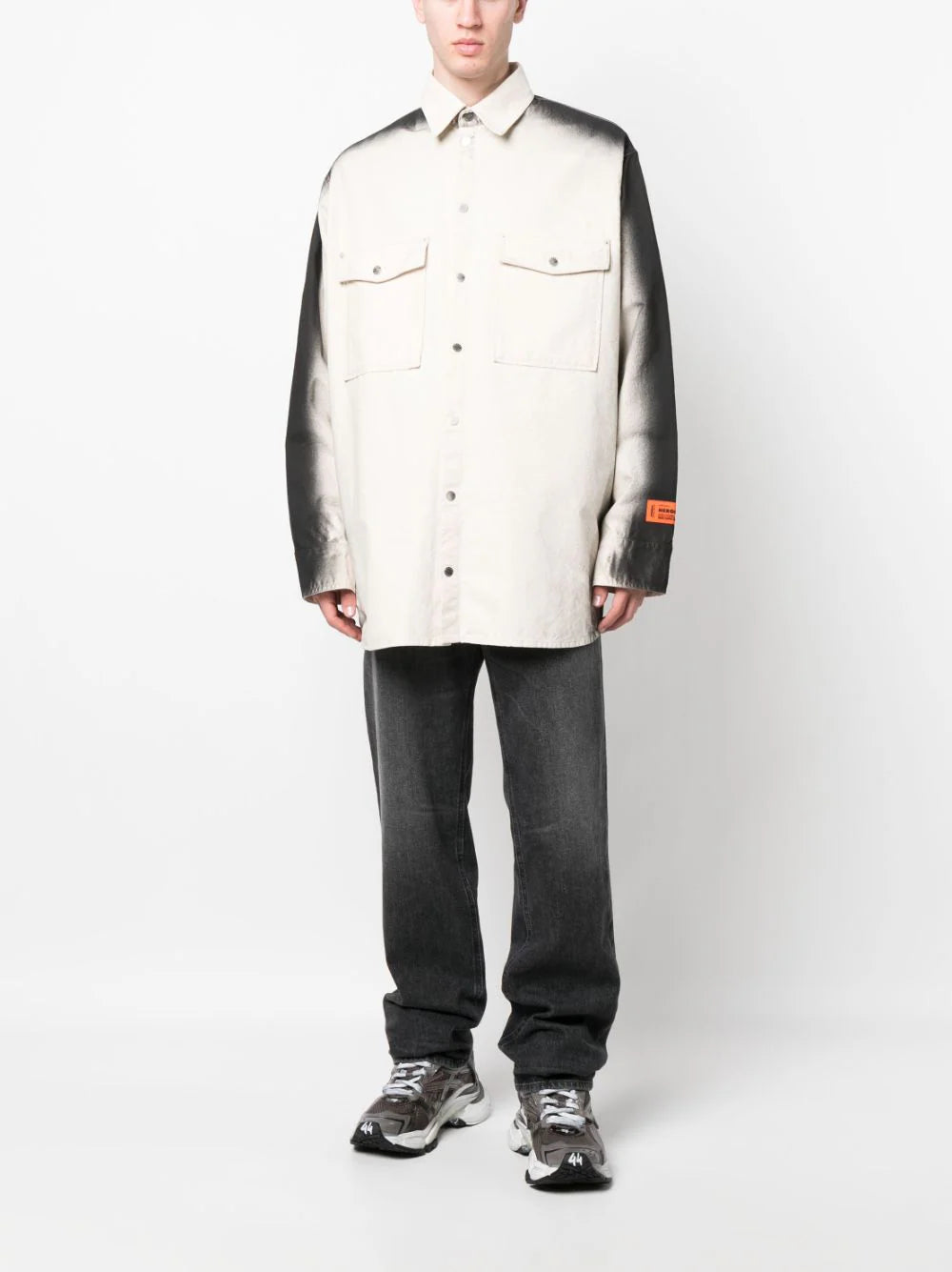 faded-effect logo-patch shirt from HERON PRESTON featuring white/black, cotton, faded effect, logo patch at the sleeve, classic collar, front button fastening, long sleeves, buttoned cuffs and straight hem.