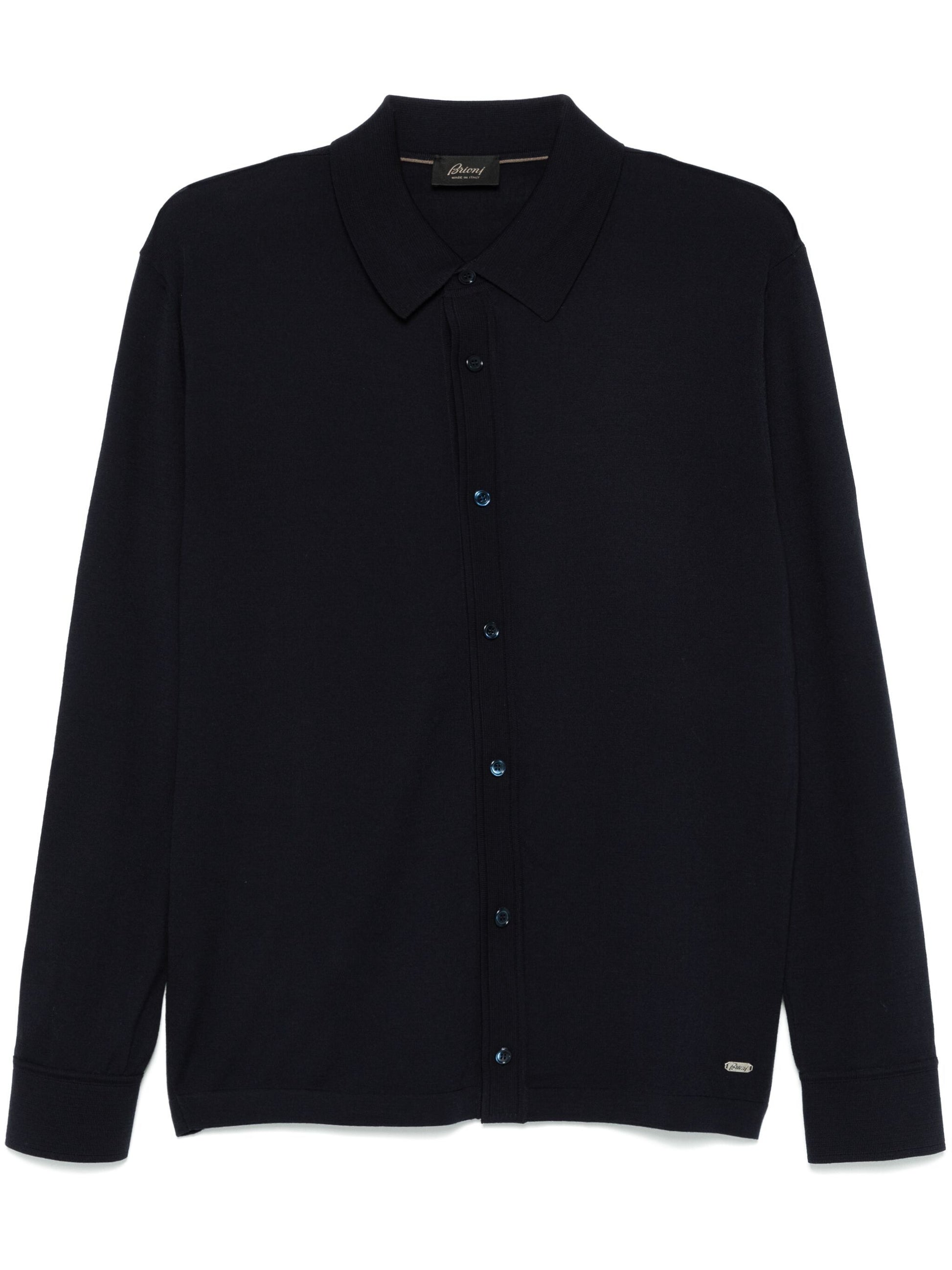 Introducing our midnight blue Fine-Knit Shirt! Made with high-quality wool, this classic shirt features a front button fastening, a classic collar, and long sleeves with buttoned cuffs. The ribbed cuffs and hem add a touch of sophistication, while the logo plaque adds a subtle branding detail. Stay warm and stylish with this must-have piece.