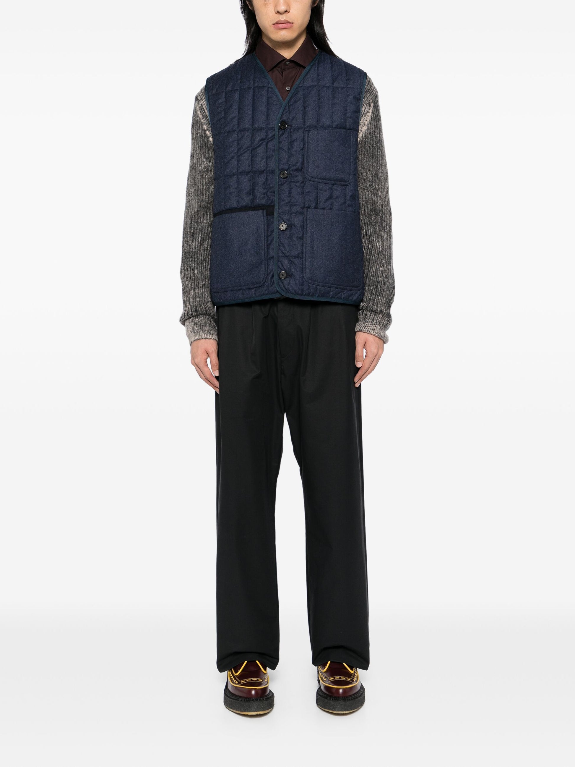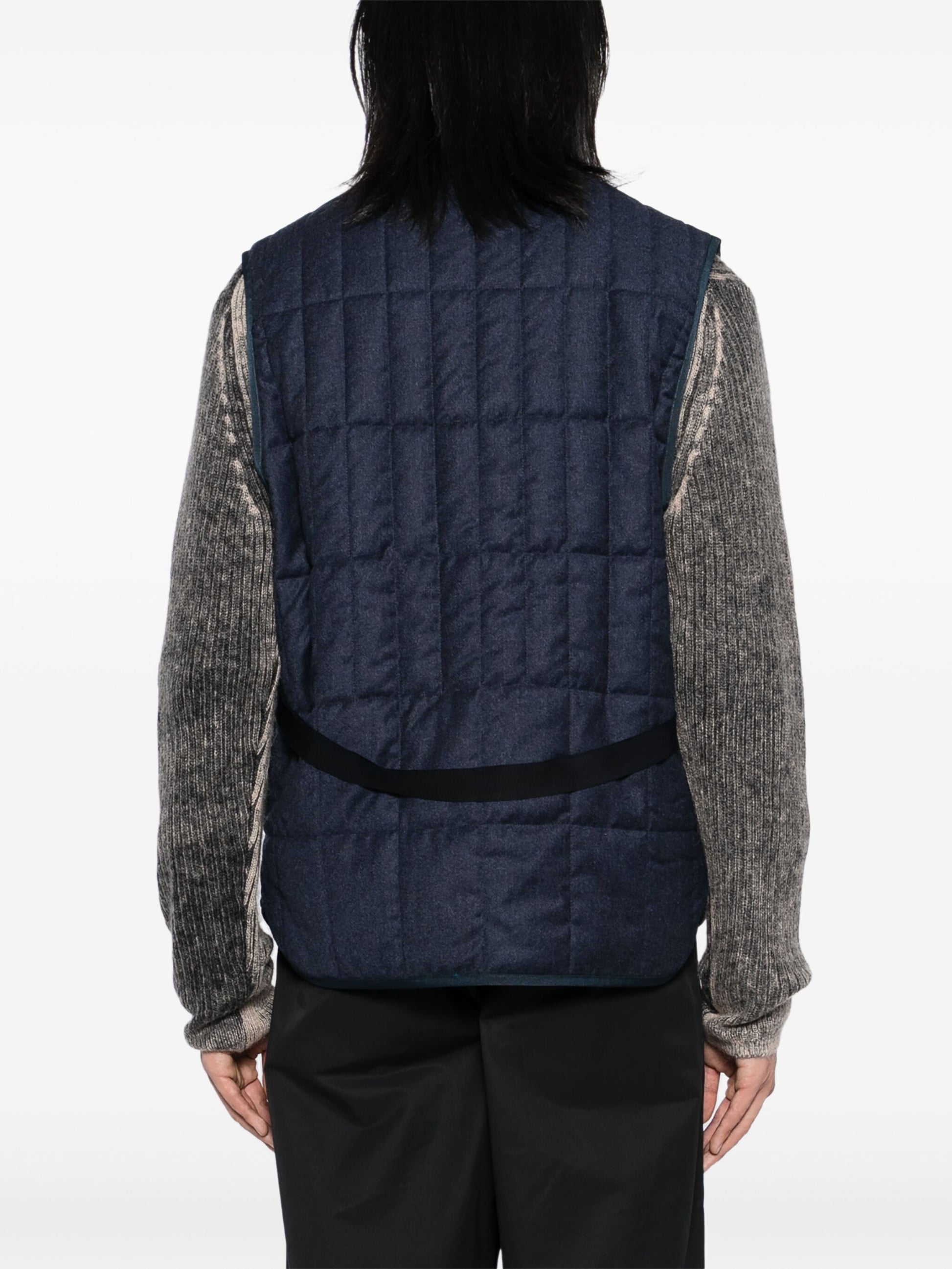 Expertly crafted from a luxurious blend of wool and cashmere, this Flannel Quilted Gilet features a quilted front and full lining for added warmth and comfort. The V-neck, button fastening, and straight hem lend a classic touch, while the two front patch pockets provide practicality. A perfect layering piece for any stylish and chilly occasion.