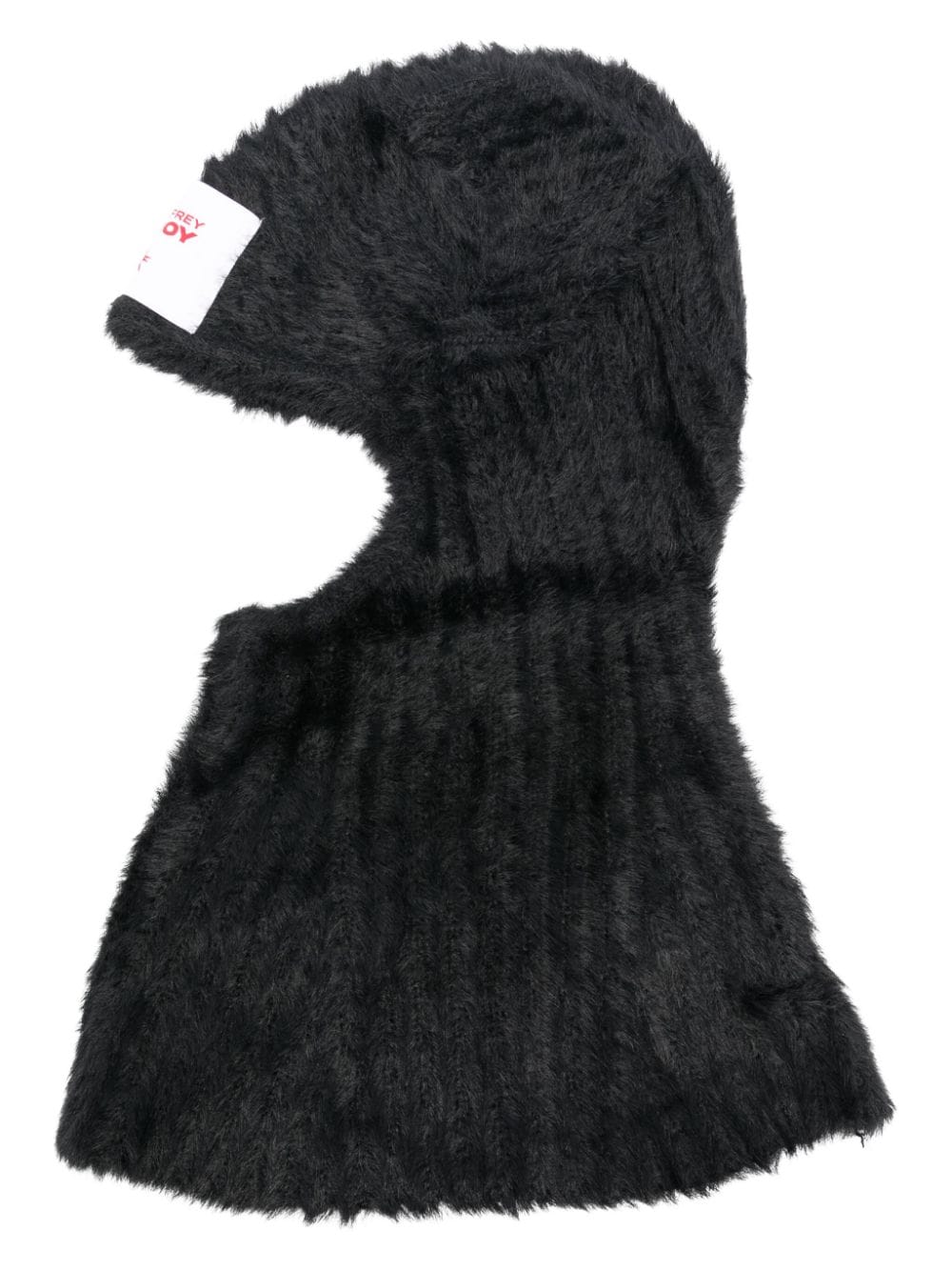 black knitted construction brushed effect logo patch to the front face opening pop-up animal ears pull-on style