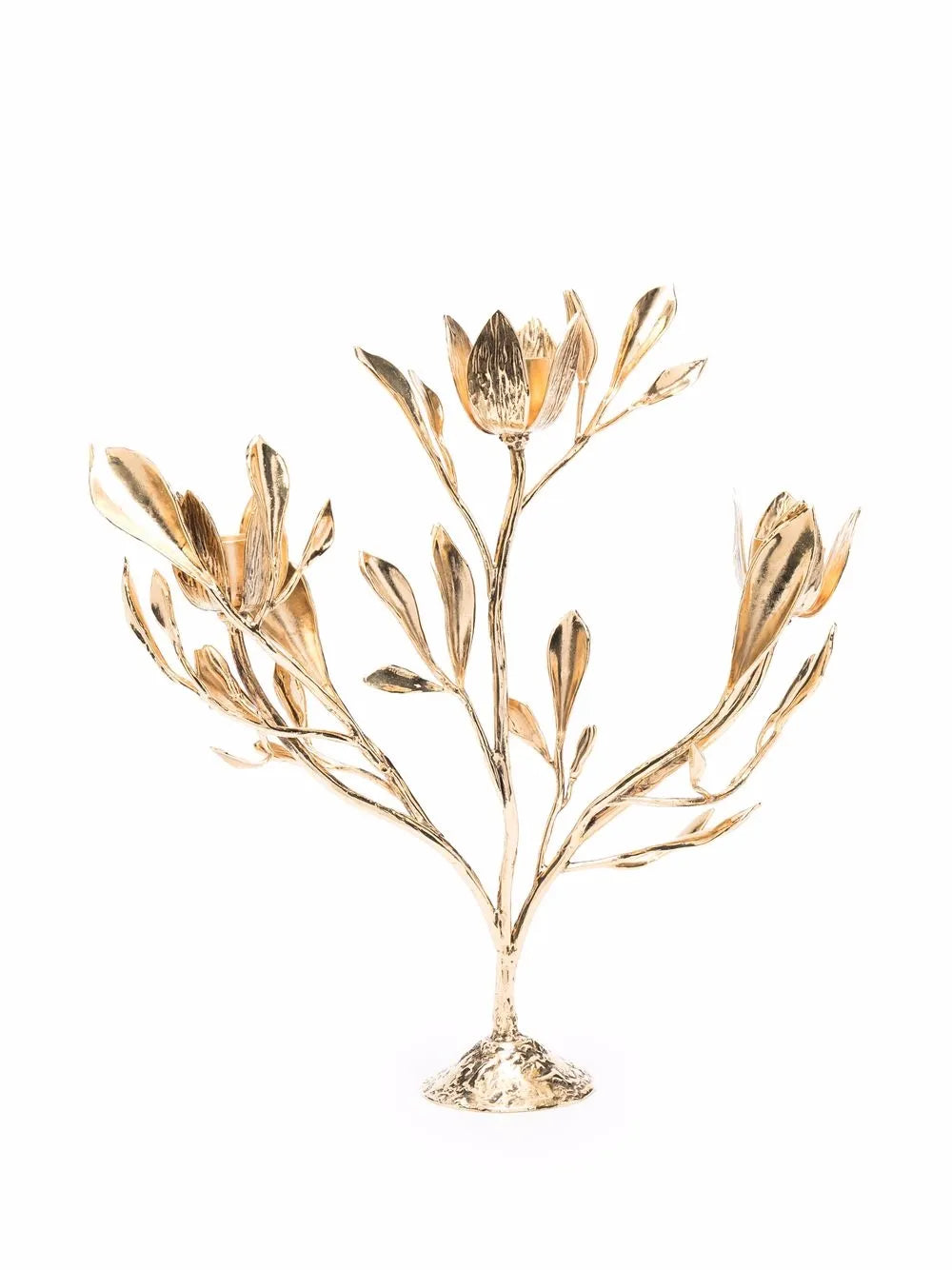 The Foliage Candelabrum showcases a refined leaf design crafted from brass and finished in polished 24kt gold-tone plating. Accentuated with matching gold-tone hardware, this elegant piece combines natural inspiration with luxurious materials, making it a striking centerpiece that enhances any sophisticated interior setting.