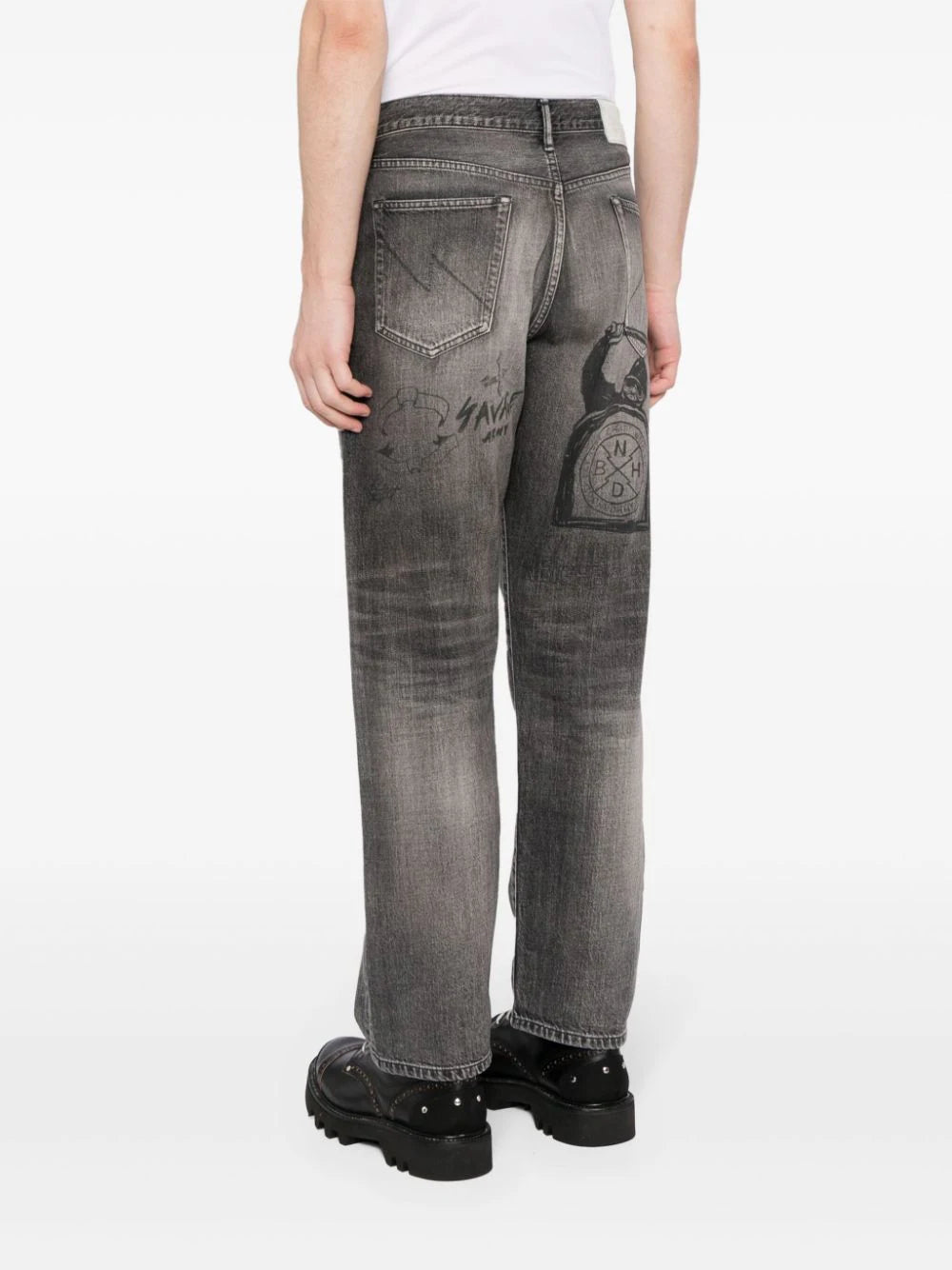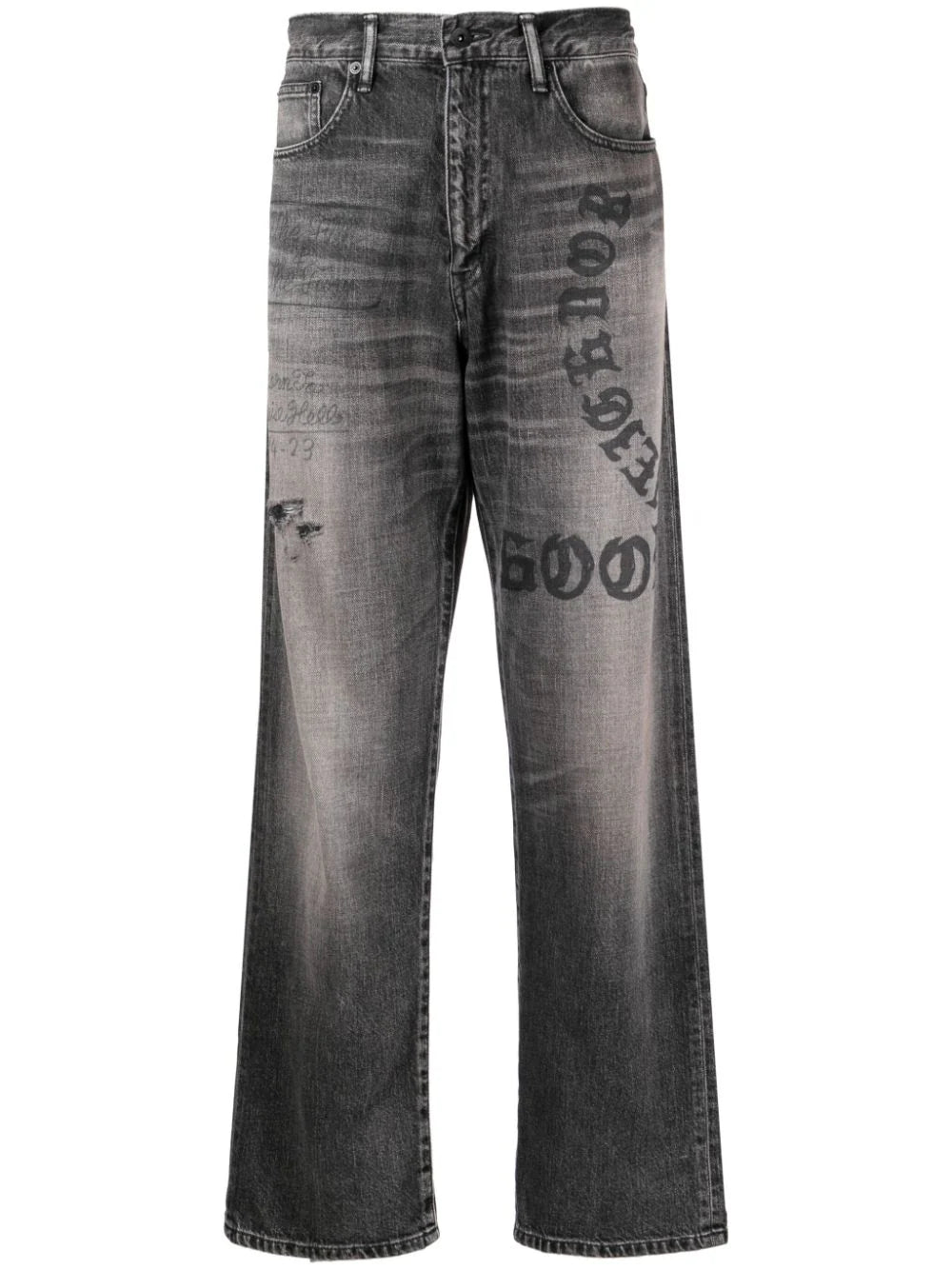 smoky black cotton denim faded effect logo print to the front graphic print to the rear logo patch to the rear belt loops mid-rise straight leg zip fly fastening classic five pockets