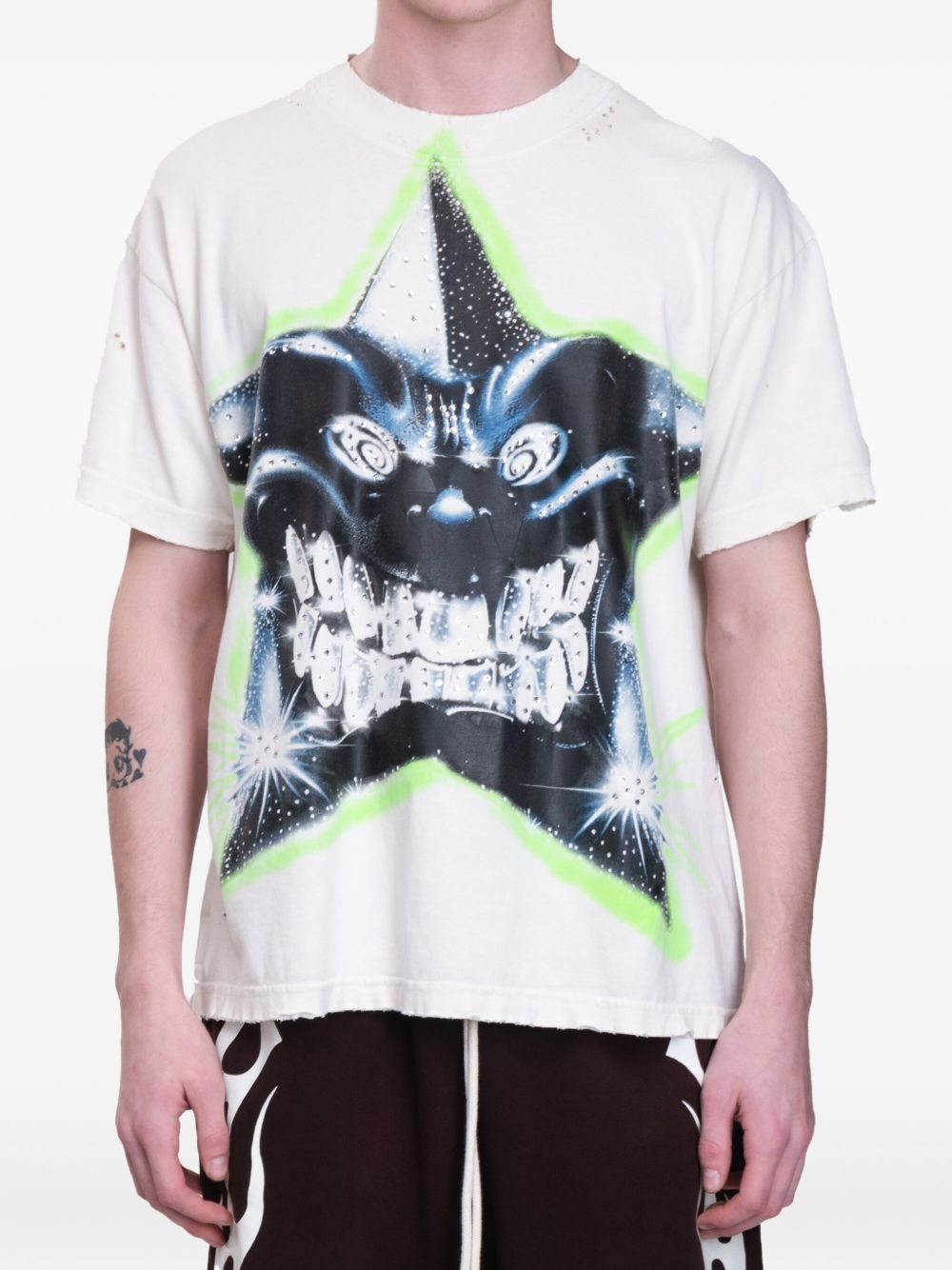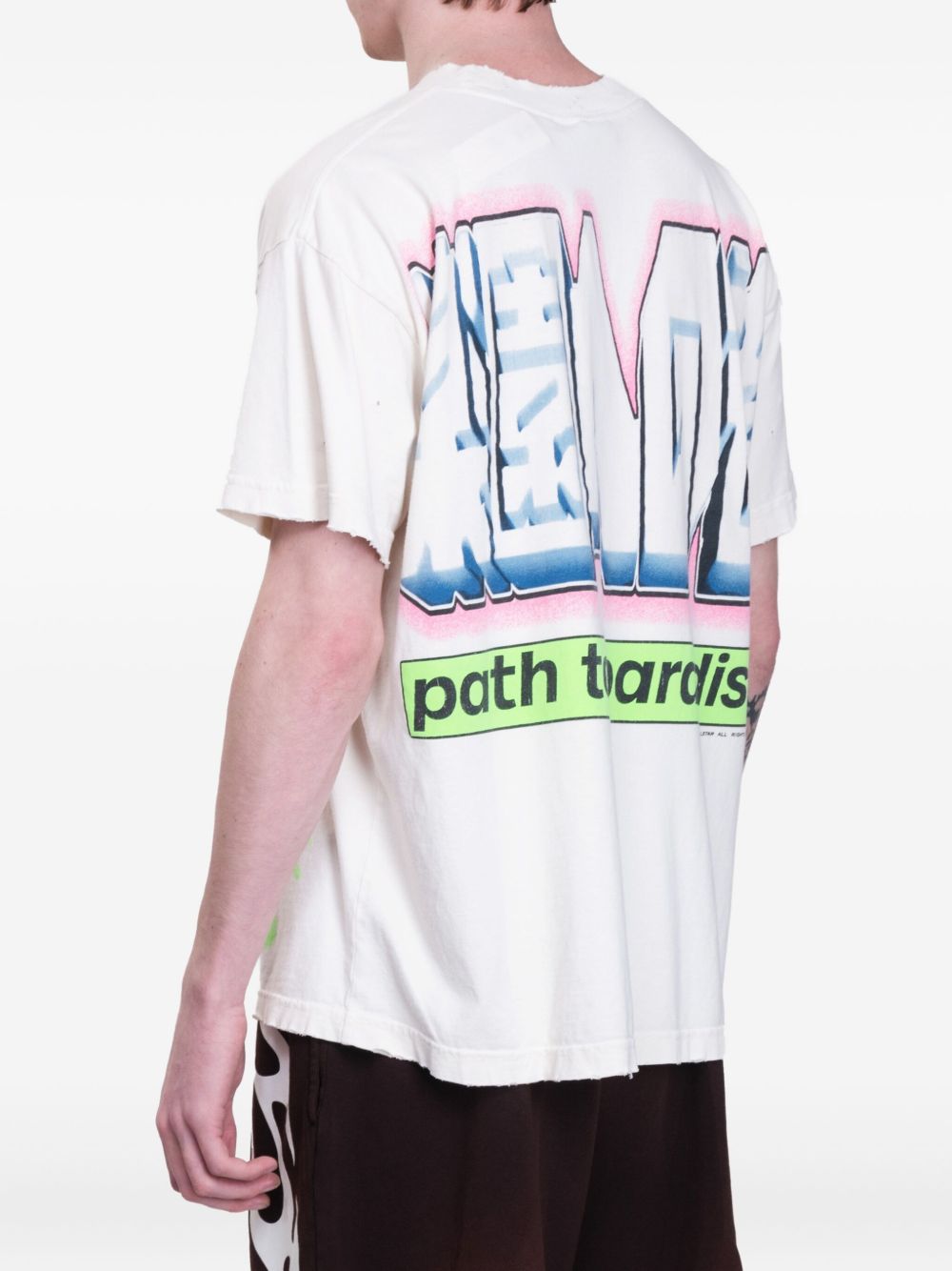 This white and multicolour graphic-print T-shirt features a classic crew neck and short sleeves for everyday comfort. It showcases bold graphic prints on both the front and rear, adding visual interest and personality. The straight hem ensures a clean, modern silhouette suitable for casual or streetwear looks.