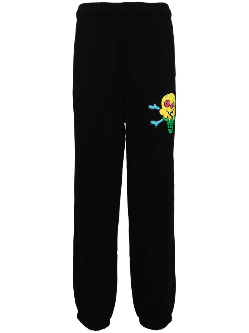 black elasticated waistband with internal drawstring two side inset pockets graphic print to the front two rear patch pockets ribbed hem