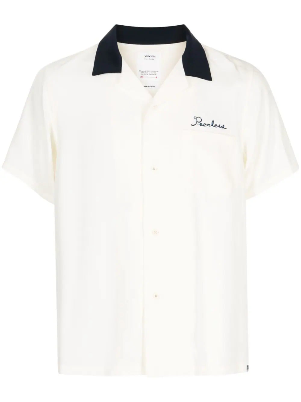 Hacking short-sleeve silk shirt from visvim featuring ivory white, prussian blue, silk, embroidered motif, embroidered slogan, contrasting collar, camp collar, front button fastening, short sleeves, chest patch pocket and straight hem.