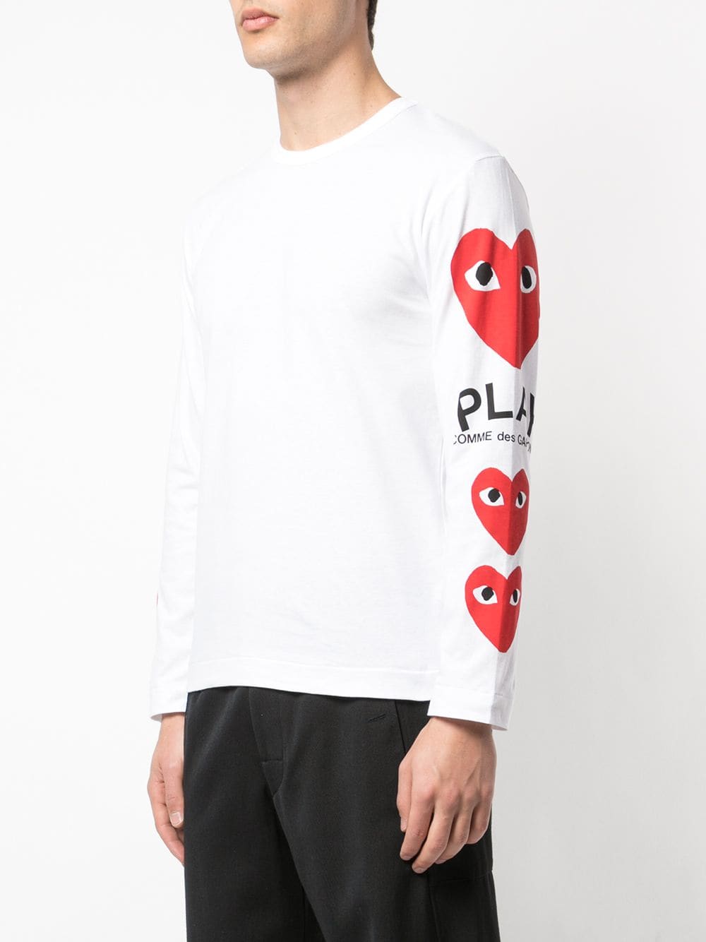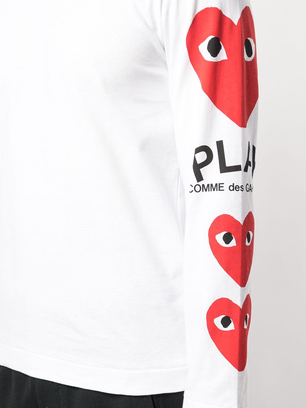 White cotton heart printed sleeves T-shirt from Comme Des Garçons Play featuring a crew neck, long sleeves, a straight hem and a logo to the left arm.