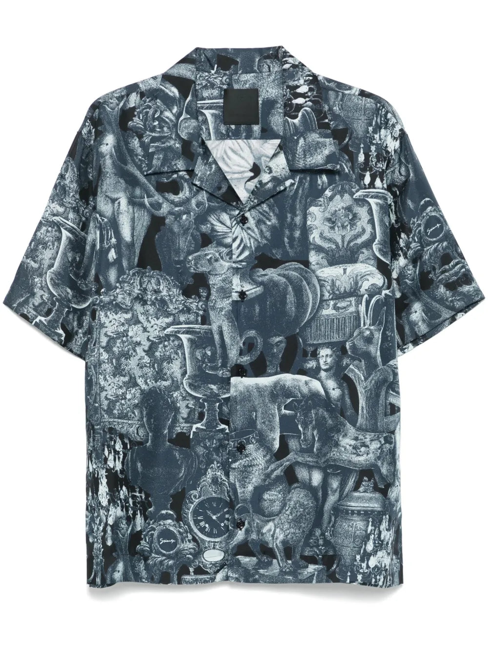 The Hubert Objects-Print Silk Shirt features an elegant silk satin weave with a unique indigo blue and multicolour print of Hubert objects. Its camp collar, front button fastening, and short sleeves provide effortless style, while the side slits and straight hem add comfort and versatility.