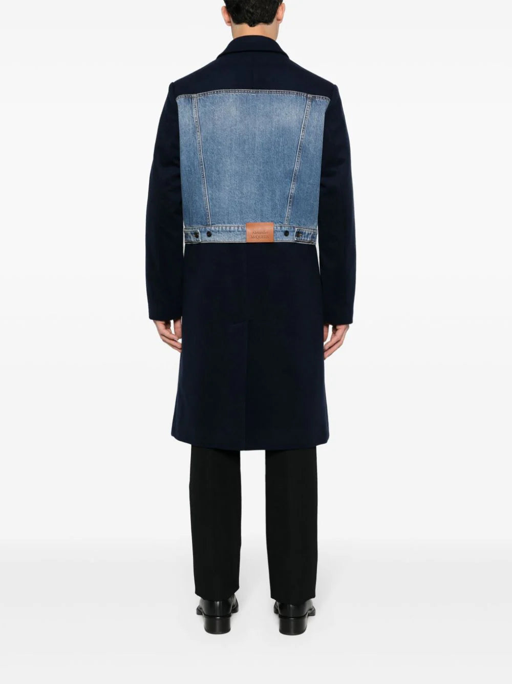 navy blue wool/cotton panelled design denim patchwork design notched lapels two chest flap pockets long sleeves two side welt pockets two side inset pockets straight hem multiple internal slip pockets full lining front button fastening