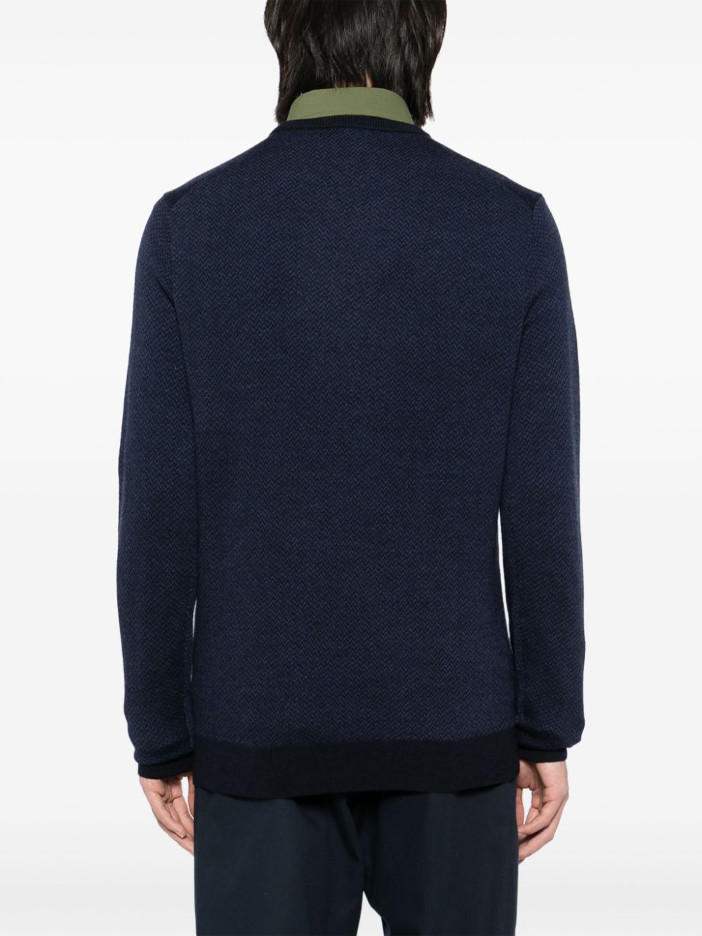 This Jacquard Sweater boasts a navy blue color, crew neck, and an embroidered logo at the chest. Its long sleeves and ribbed cuffs and hem provide warmth and comfort. Perfect for any occasion, this sweater is a stylish and versatile addition to any wardrobe.