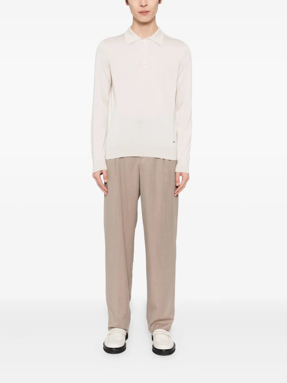 This ivory knitted polo shirt features a front button fastening and long sleeves for a classic silhouette. Ribbed cuffs and hem provide structure and durability, combining timeless style with comfortable, refined knitwear craftsmanship.