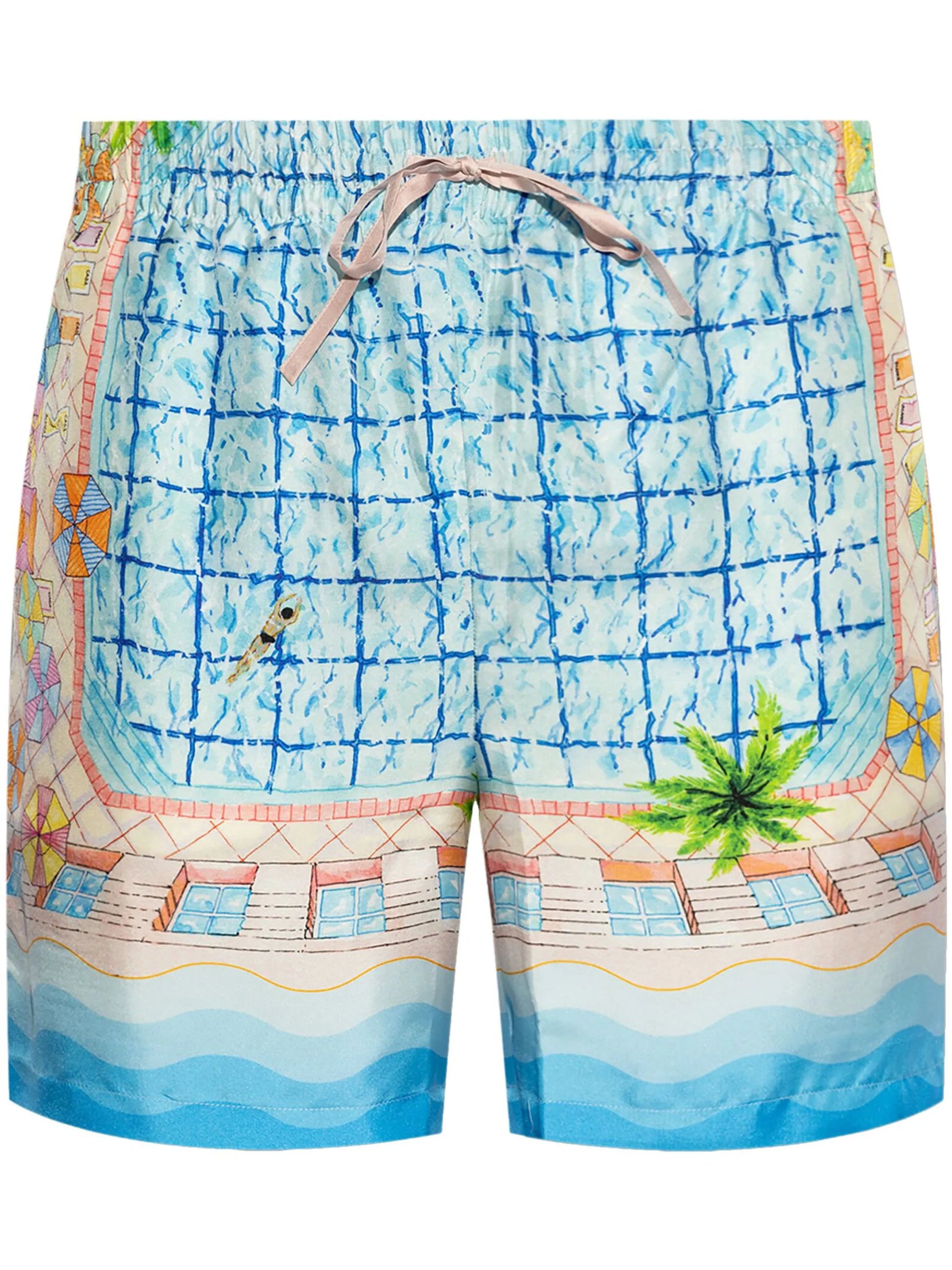 blue/multicolour silk satin finish all-over graphic print elasticated drawstring waistband two side inset pockets rear patch pocket straight leg above-knee length