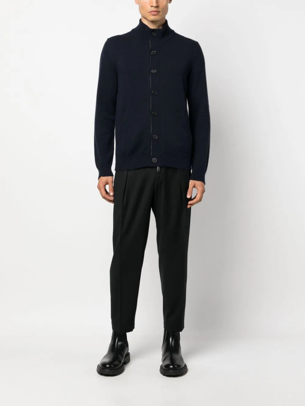 leather-trimmed cashmere cardigan from BRIONI featuring navy blue, cashmere, fine knit, leather trim, concealed front zip fastening, front button fastening, long sleeves, two diagonal pockets to the sides and ribbed-knit edge.