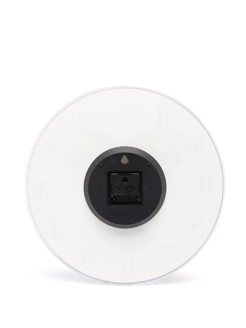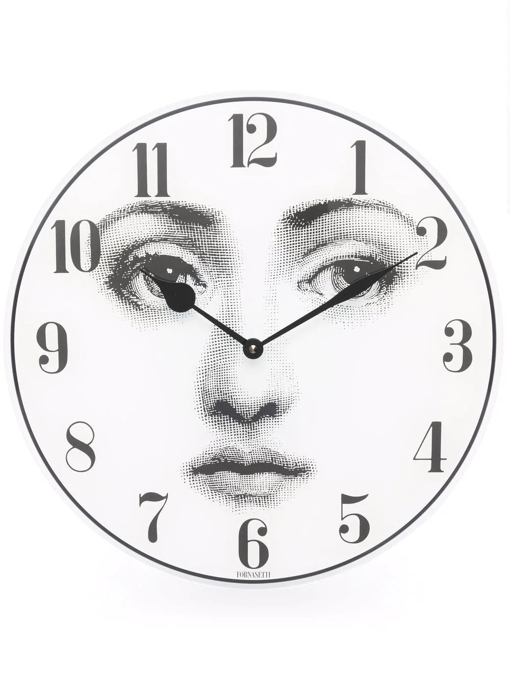 White/black glass Lina Cavalieri clock from FORNASETTI featuring signature Lina Cavalieri print, two-tone design and battery-operated movement.