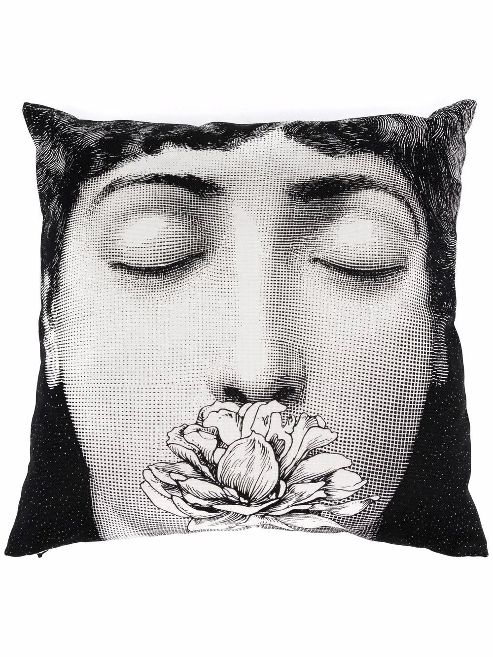 White/black cotton Lina Cavalieri-print cushion from FORNASETTI featuring square shape, signature Lina Cavalieri print and logo patch to the side.