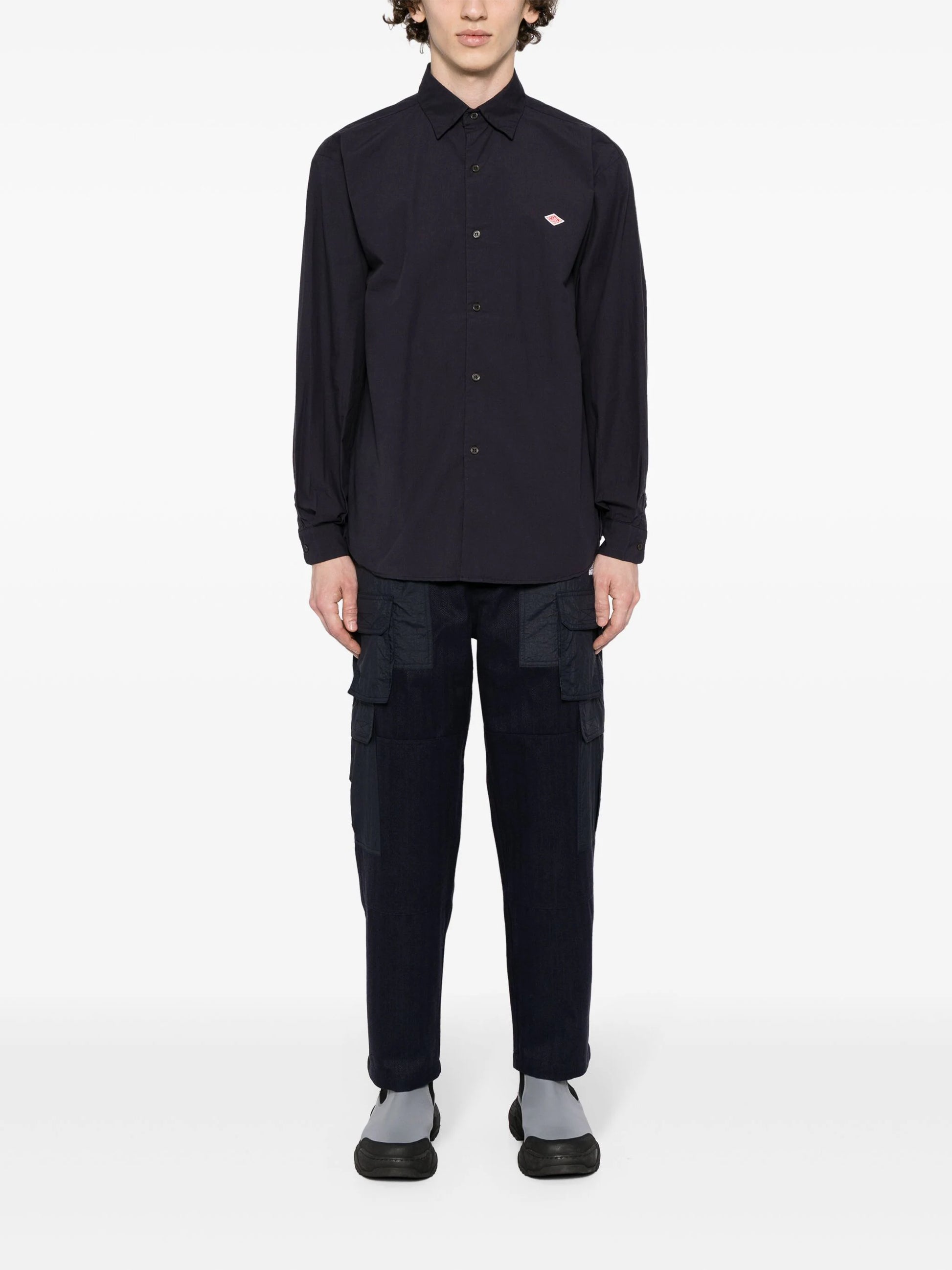 navy blue cotton appliqué logo spread collar front button fastening long sleeves buttoned cuffs curved hem