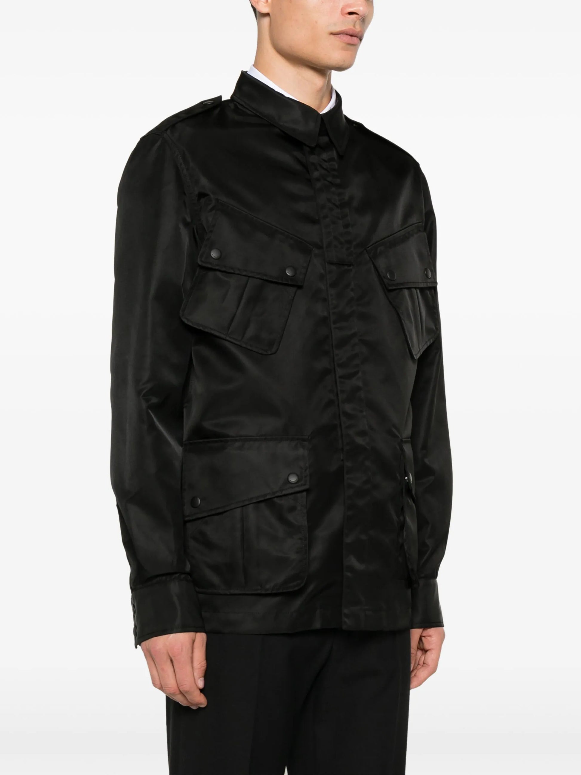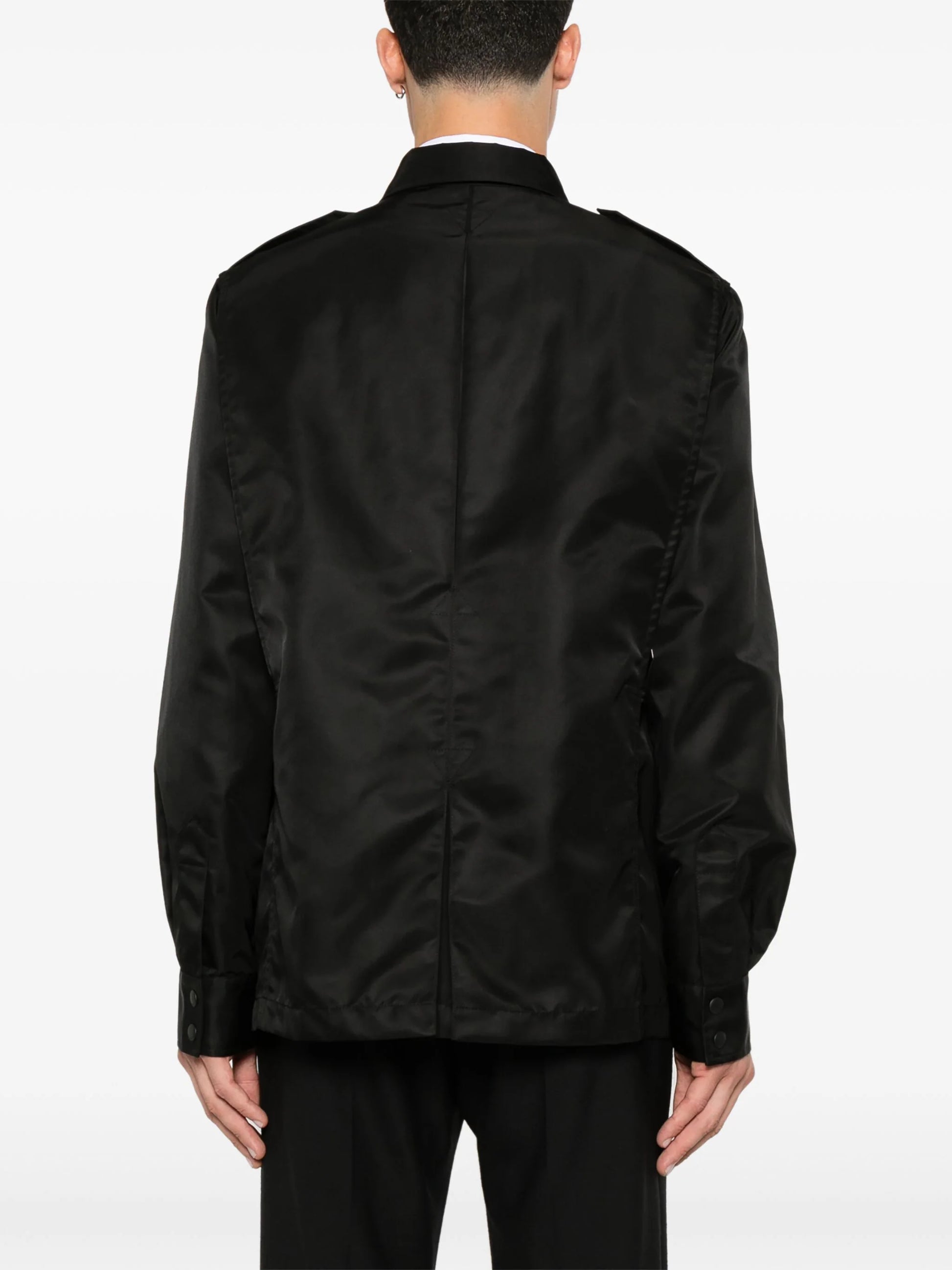 black twill weave concealed front zip fastening classic collar epaulettes long sleeves press-stud fastening cuffs four front flap pockets appliqué logo to the front pleat detailing to the rear straight hem