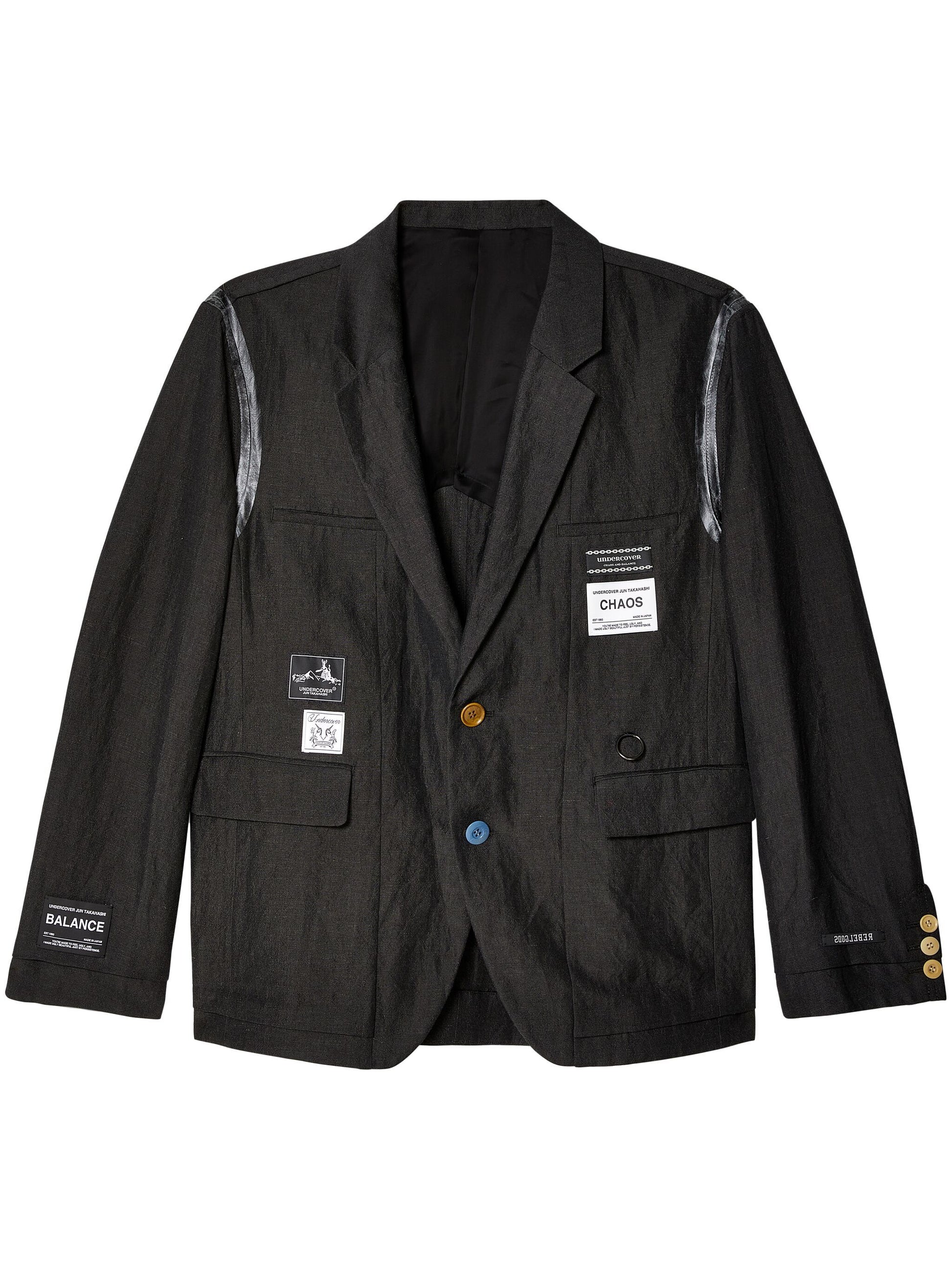 black linen-wool blend appliqué logo notched lapels front button fastening long sleeves buttoned cuffs two chest welt pockets two front flap pockets straight hem