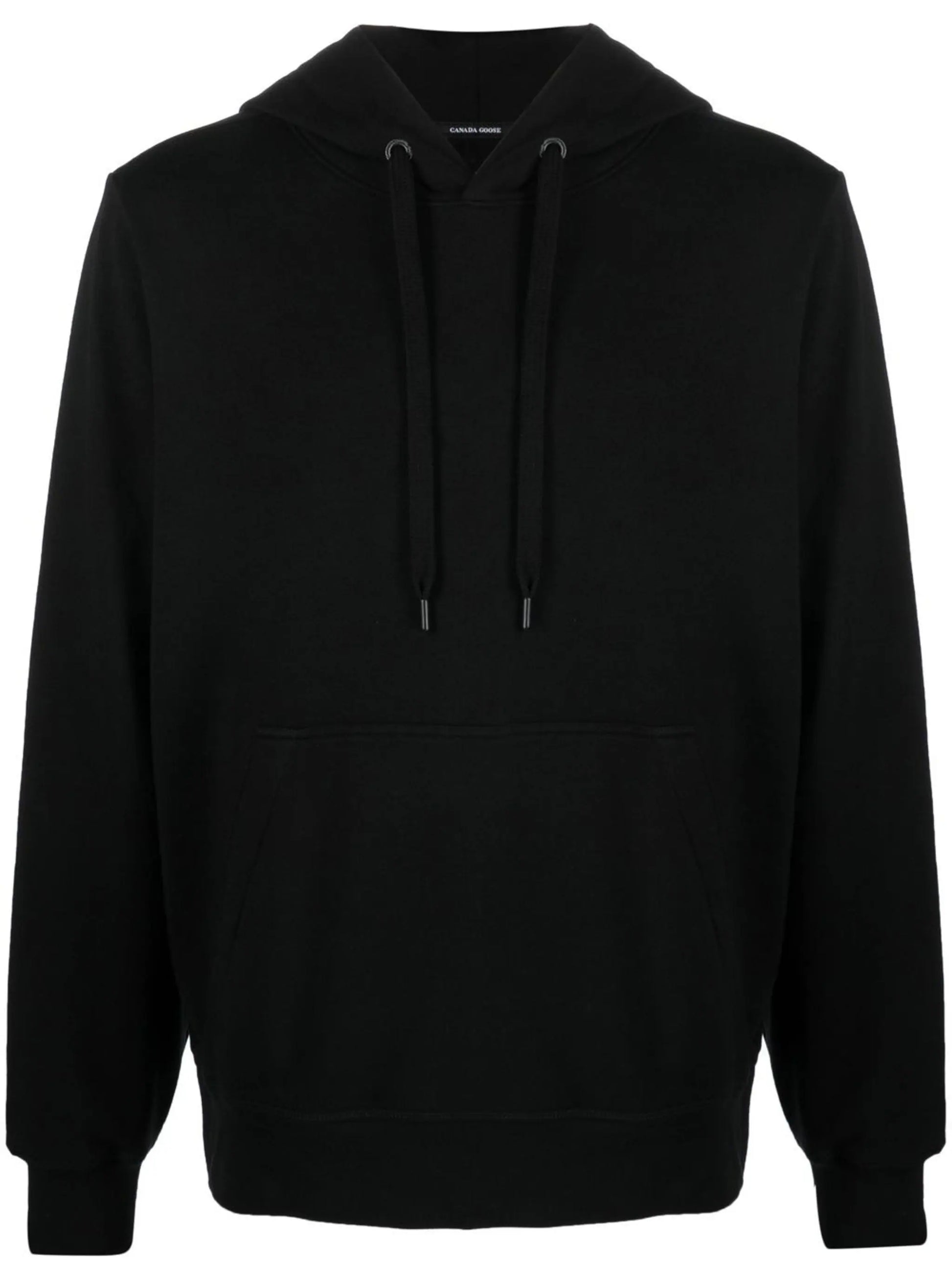 This Logo Drawstring Hoodie is made of comfortable black cotton and features a logo patch on the sleeve for added style. The drawstring hood and front pouch pocket provide both warmth and convenience. Perfect for any casual occasion.