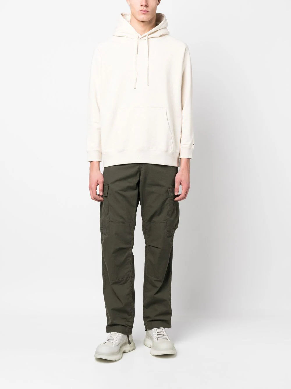 light beige cotton embroidered logo at the sleeve drawstring hood long sleeves ribbed trim front pouch pocket