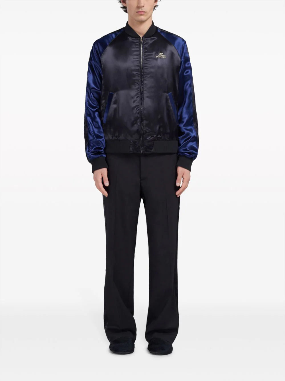 navy blue satin finish baseball collar embroidered logo at the chest embroidered logo to the rear front zip fastening two side welt pockets long raglan sleeves elasticated cuffs elasticated hem