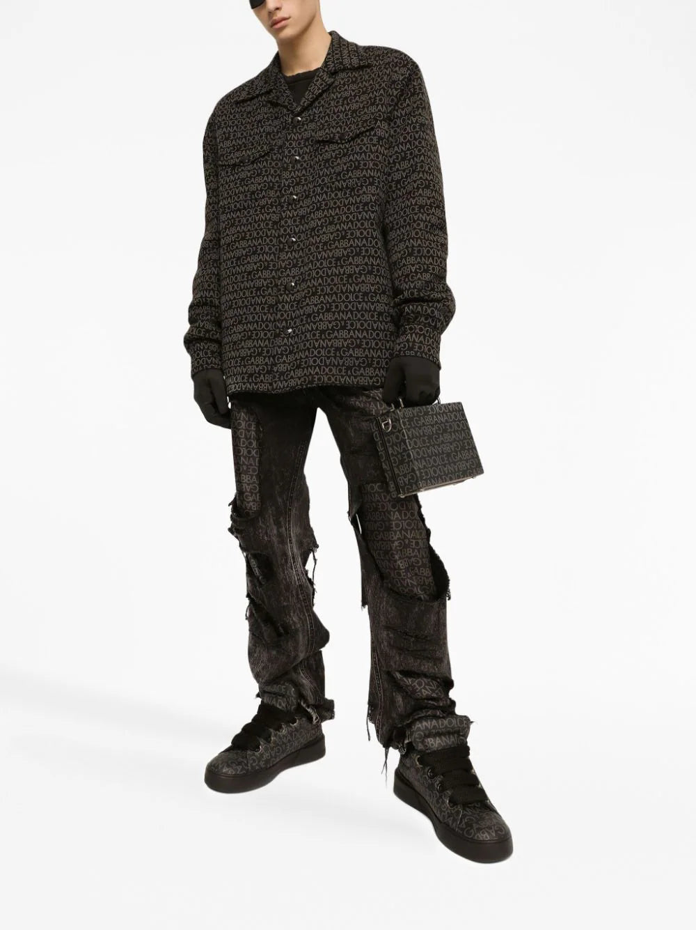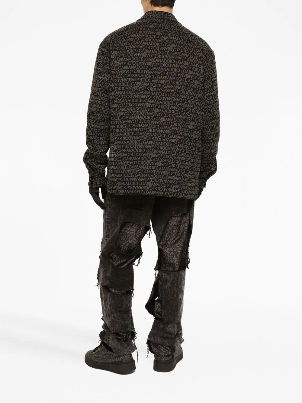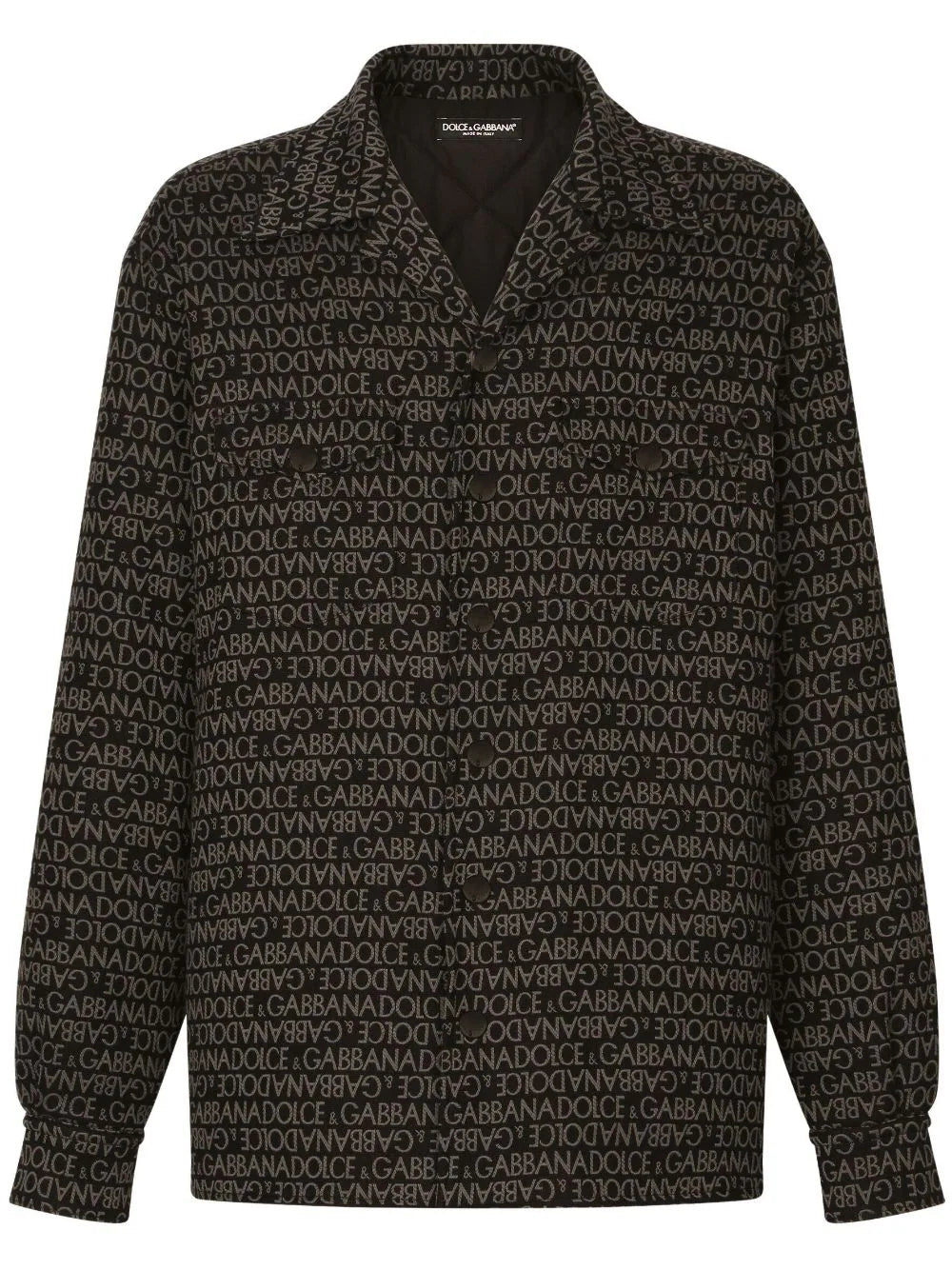 logo-printed shirt jacket from DOLCE & GABBANA featuring black, all-over logo print, peak lapels, front button fastening, long sleeves, two chest flap pockets and straight hem.