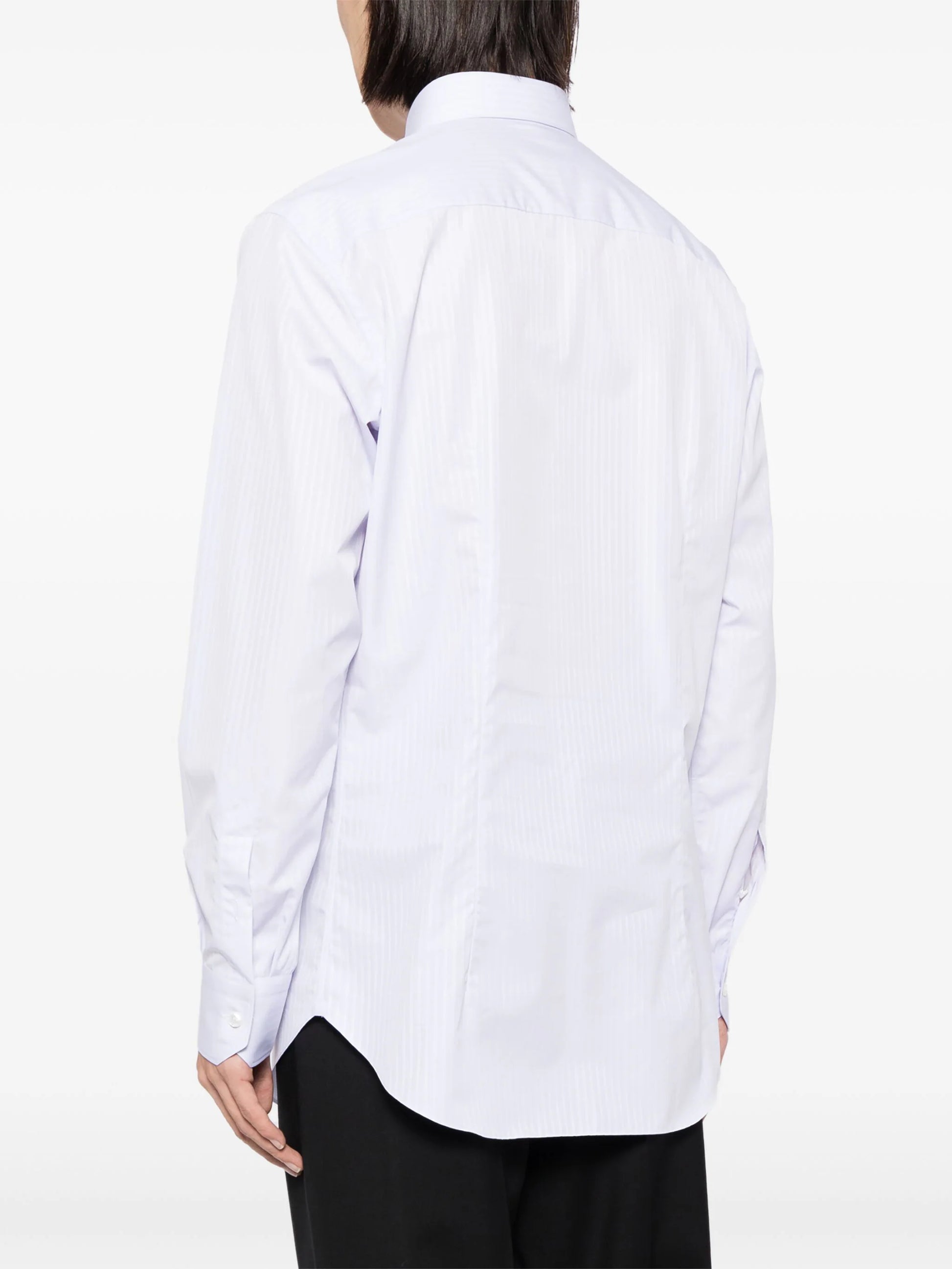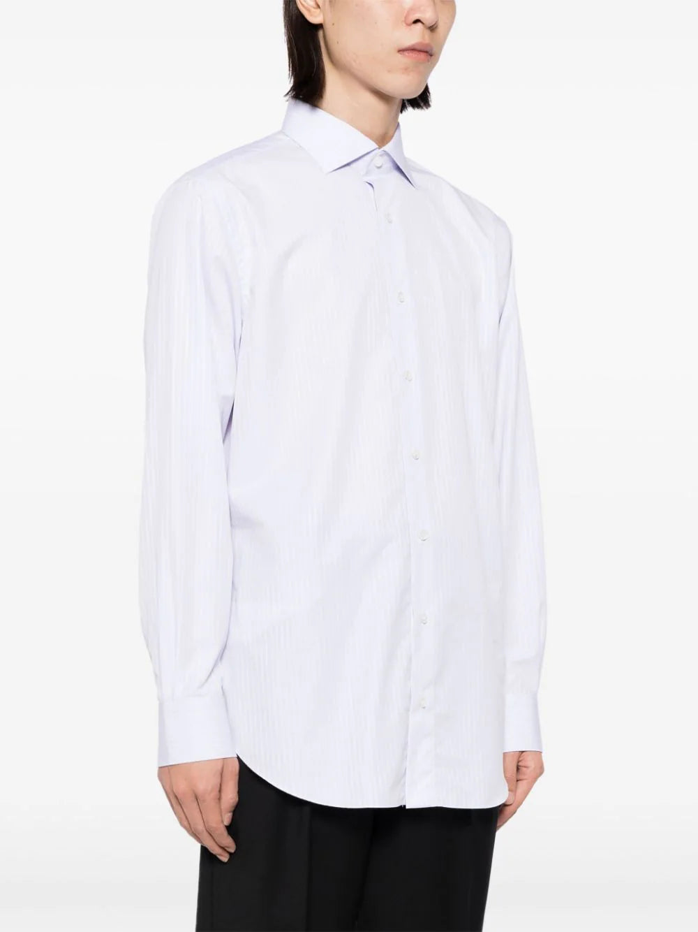lilac purple cotton pinstripe pattern classic collar button fastening buttoned cuffs long sleeves curved hem