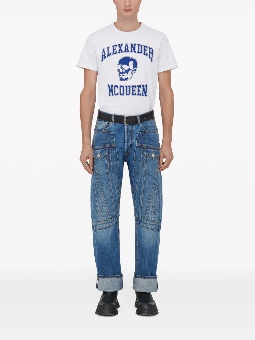 indigo blue cotton denim panelled design concealed fly and button fastening straight leg mid-rise belt loops classic five pockets two front flap pockets two side inset pockets turn-up hem