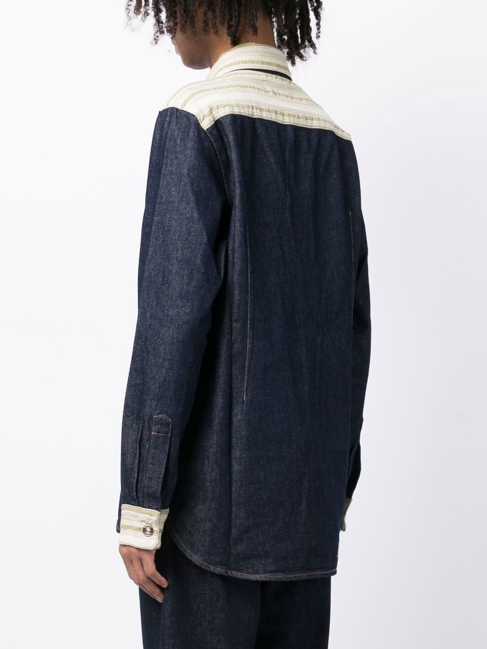 Miles denim shirt from Wales Bonner featuring blue, cotton, stripe trim, contrast stitching, classic collar, front button fastening, long sleeves, buttoned cuffs, chest patch pocket and curved hem.