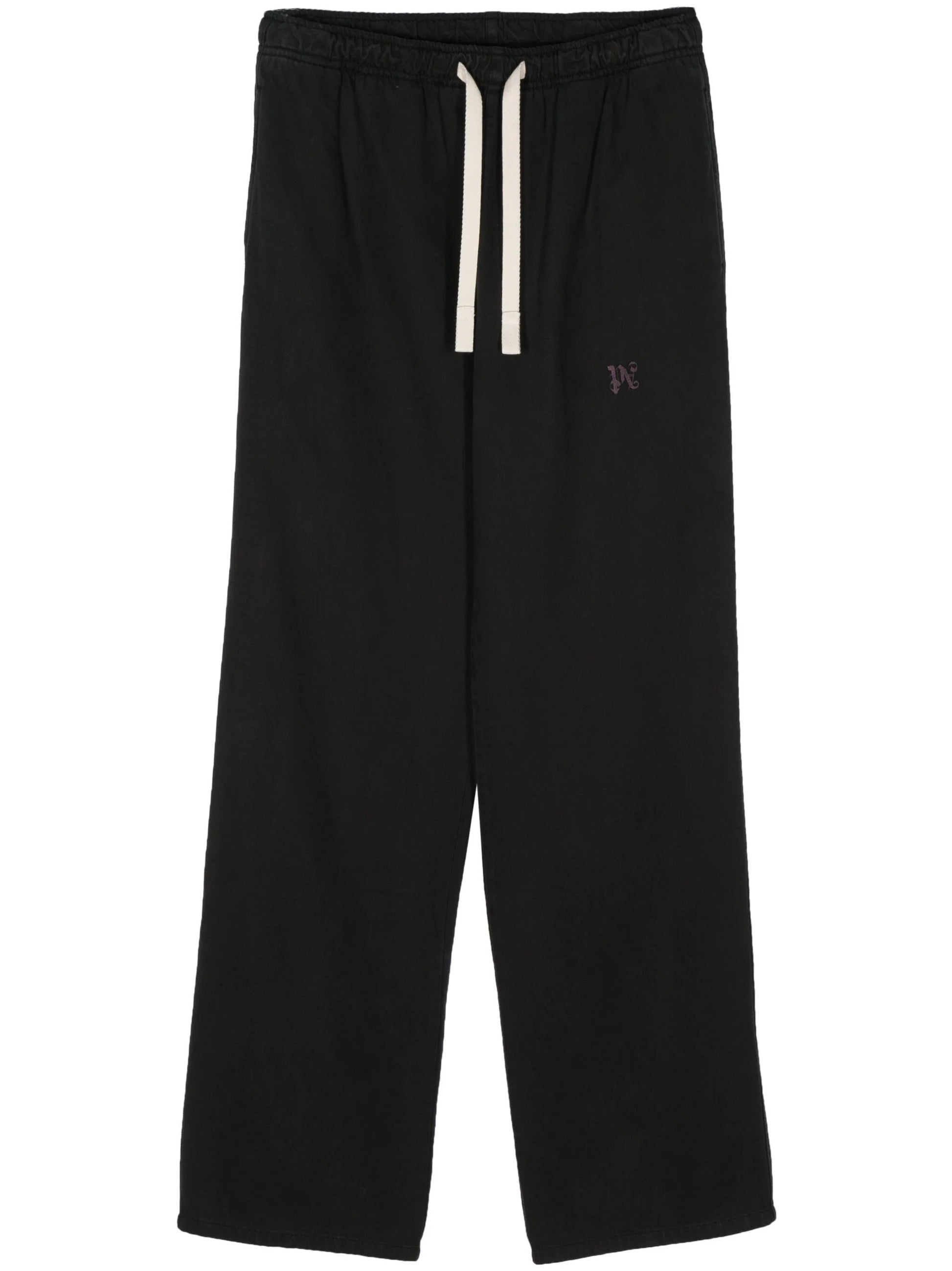 black lyocell-cotton blend twill weave elasticated waistband two side welt pockets monogram embroidery to the side two rear welt pockets straight leg drawstring fastening waist