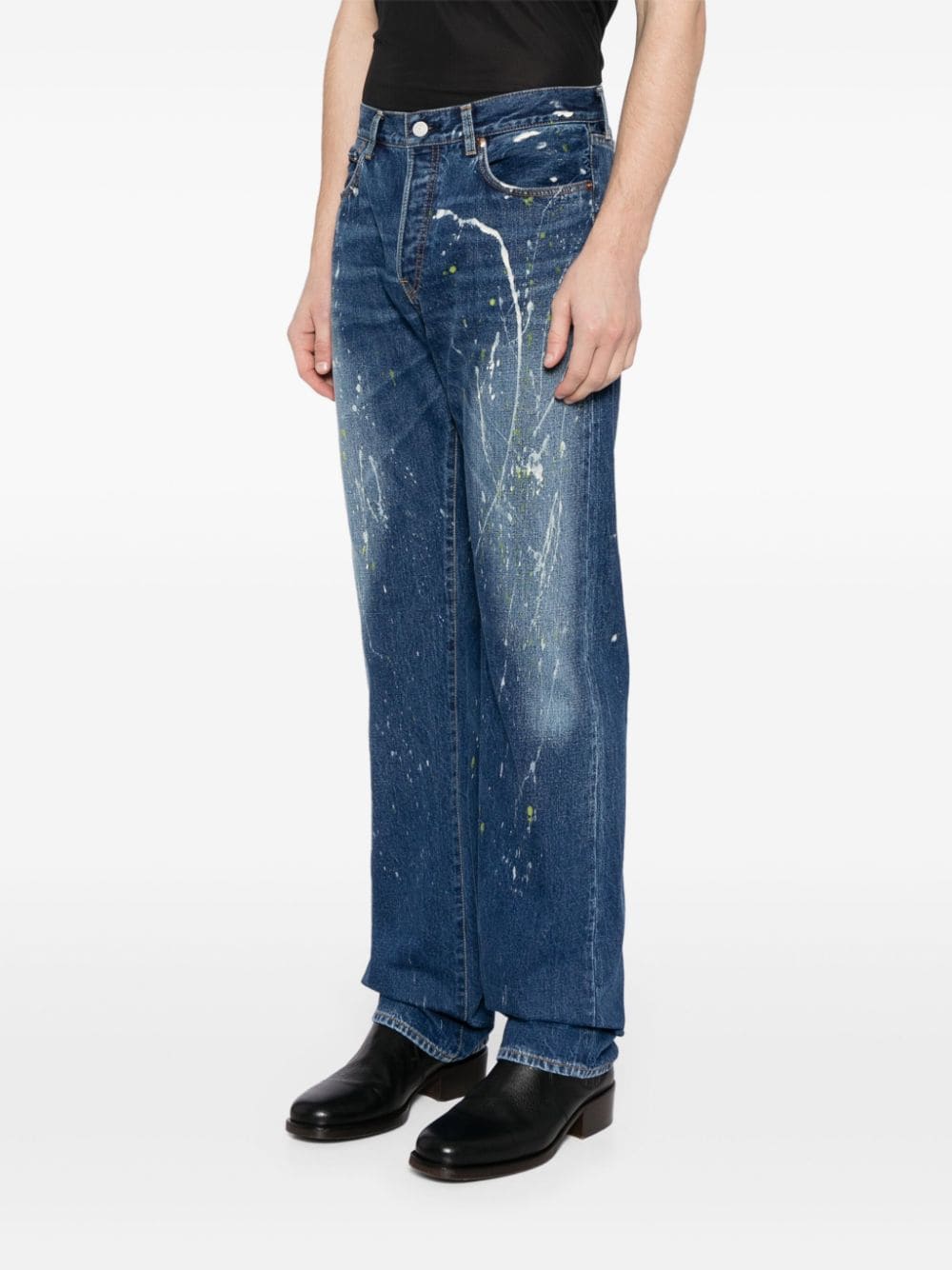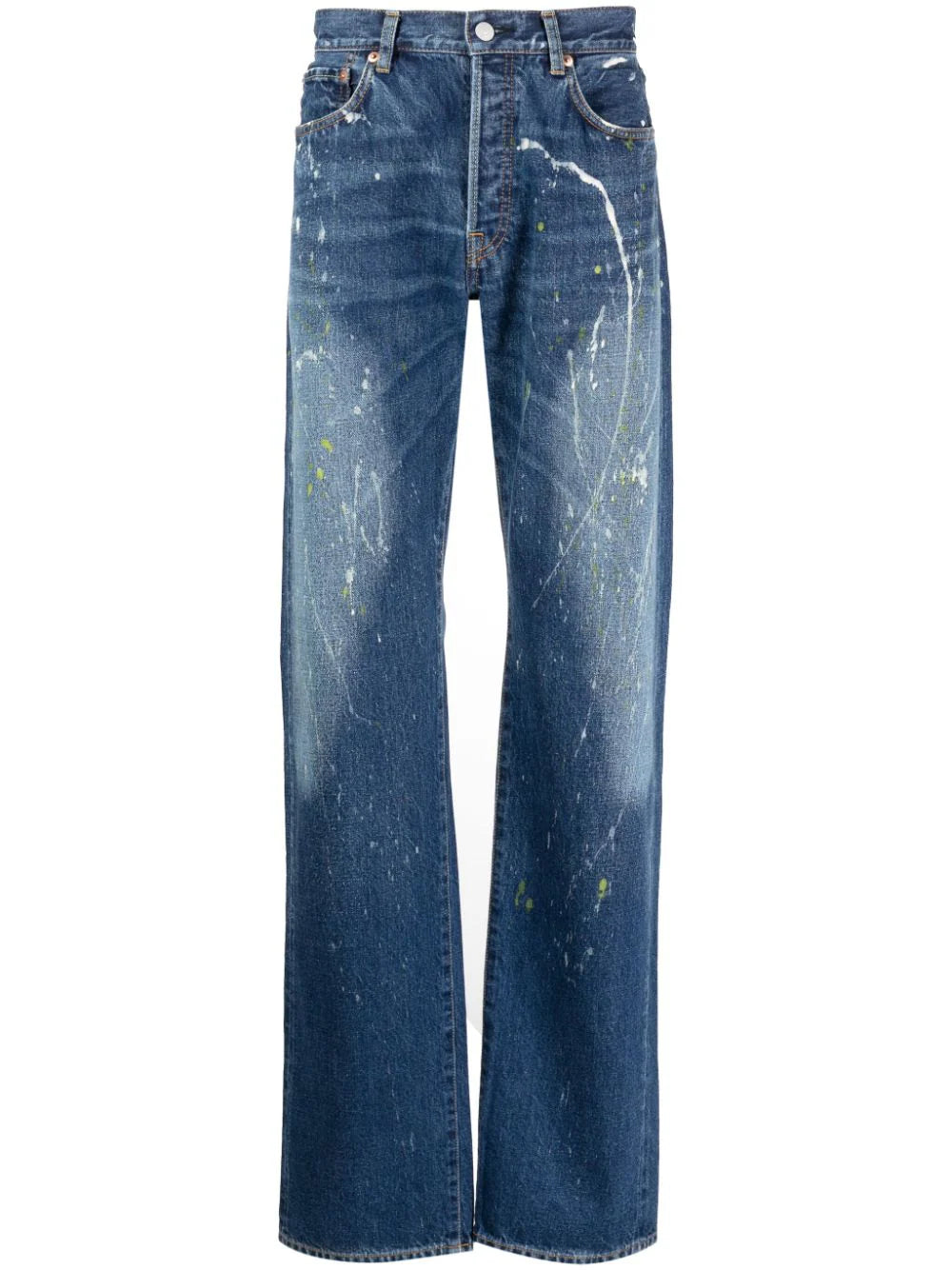 indigo blue cotton washed denim paint splatter detail faded effect appliqué logo mid-rise concealed fly and button fastening belt loops straight leg classic five pockets