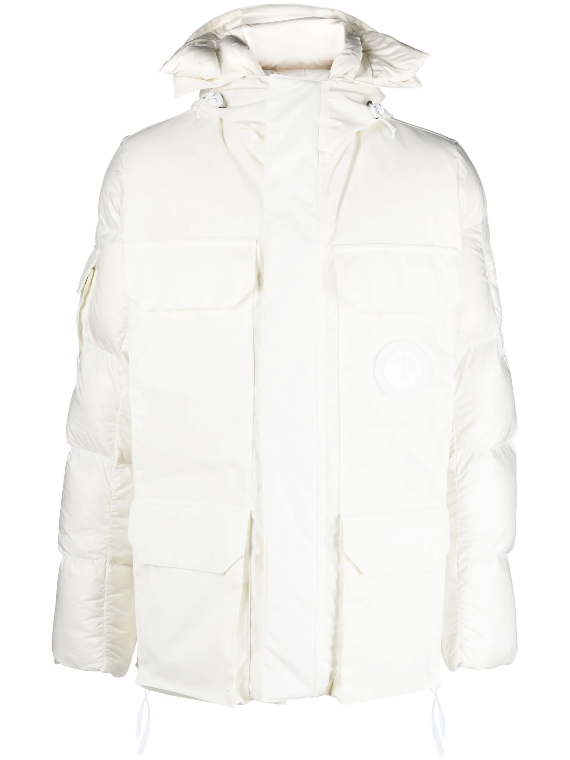 Paradigm Expedition hooded padded jacket from CANADA GOOSE featuring white, duck down, padded design, ribbed cuffs, logo patch to the front, classic hood, concealed front fastening, long sleeves, logo shoulder strap, two chest flap pockets, two front flap pockets and straight hem.