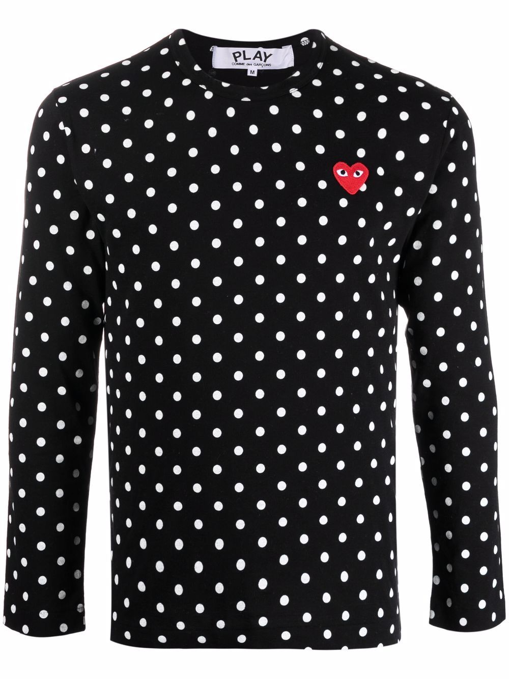 Black/white/red cotton polka dot-print long-sleeved T-shirt from COMME DES GARÇONS PLAY featuring polka dot print, logo patch at the chest, round neck, long sleeves and straight hem.