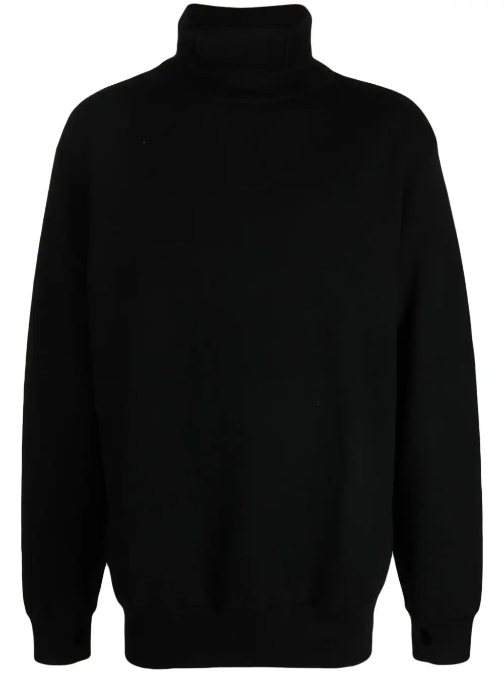 jet black merino wool knitted construction roll neck drop shoulder long sleeves ribbed cuffs and hem