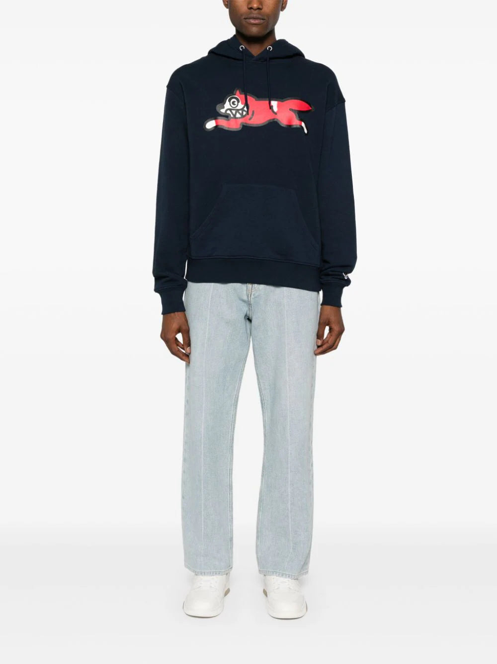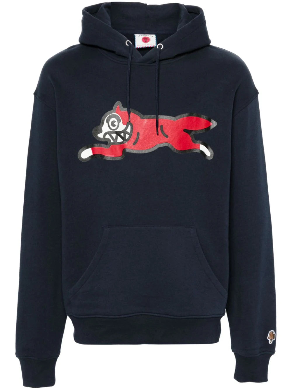 navy blue cotton jersey texture drawstring hood drop shoulder long sleeves logo patch at the sleeve ribbed cuffs and hem Running Dog print at the chest front pouch pocket logo print to the rear straight hem