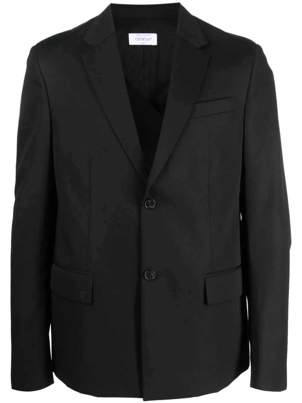 single-breasted wool blazer from OFF-WHITE featuring black, virgin wool, embroidered logo to the front, notched lapels, front button fastening, long sleeves, buttoned cuffs, jetted chest pocket, front flap pockets and straight hem.