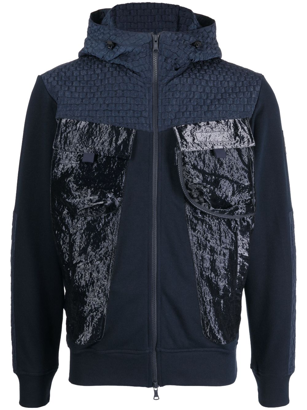 stand-up collar hooded jacket from PAUL & SHARK featuring navy blue, cotton, stand-up collar, drawstring hood, front two-way zip fastening, two chest flap pockets, rear flap pocket, long sleeves, elasticated cuffs, elasticated hem and straight hem.