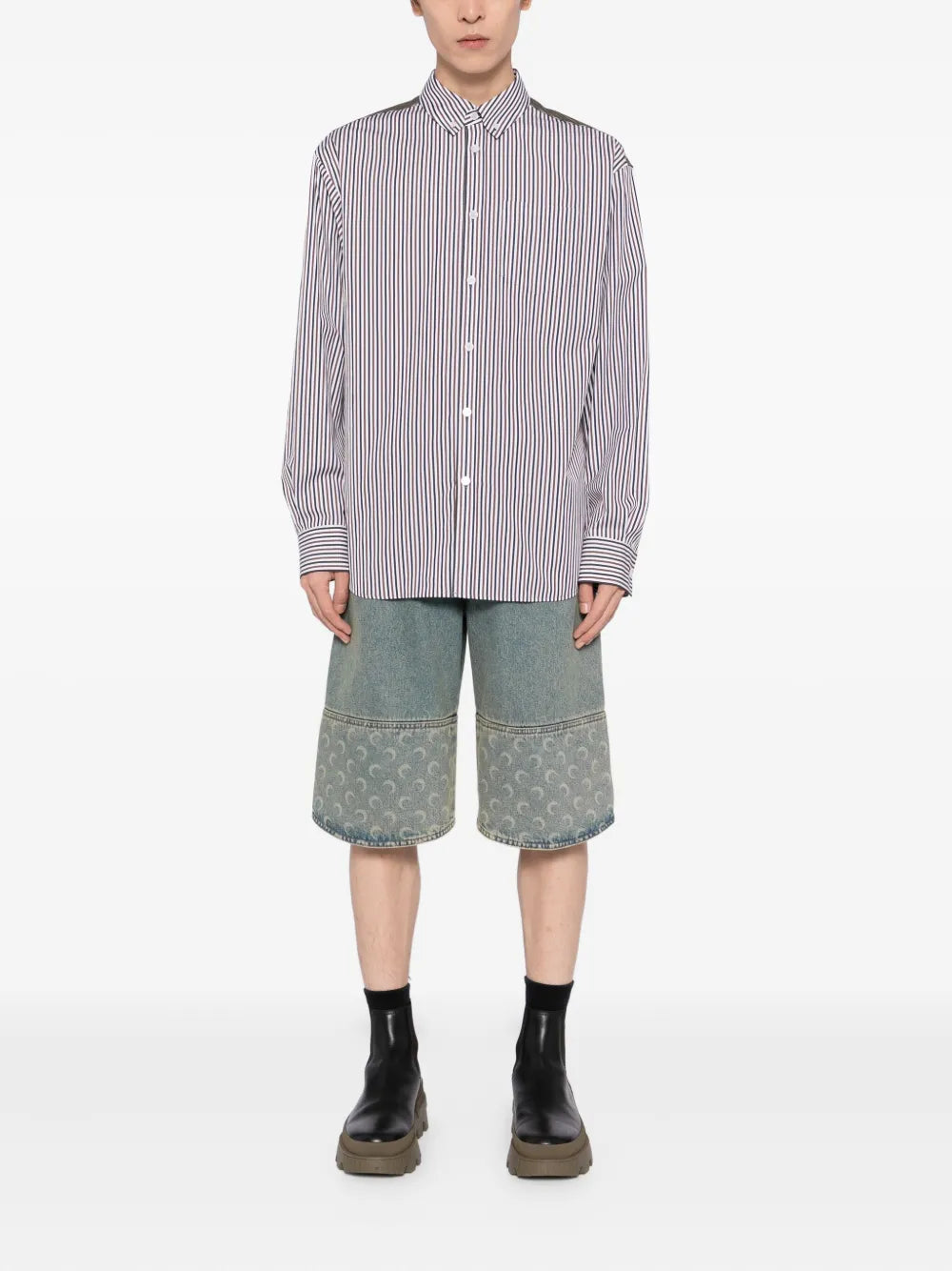 This white striped button-down shirt features a front button fastening and a chest patch pocket for added practicality. Buttoned cuffs ensure a tailored fit, enhancing its polished and professional appearance. Crafted for versatility, it pairs seamlessly with both formal and casual outfits.