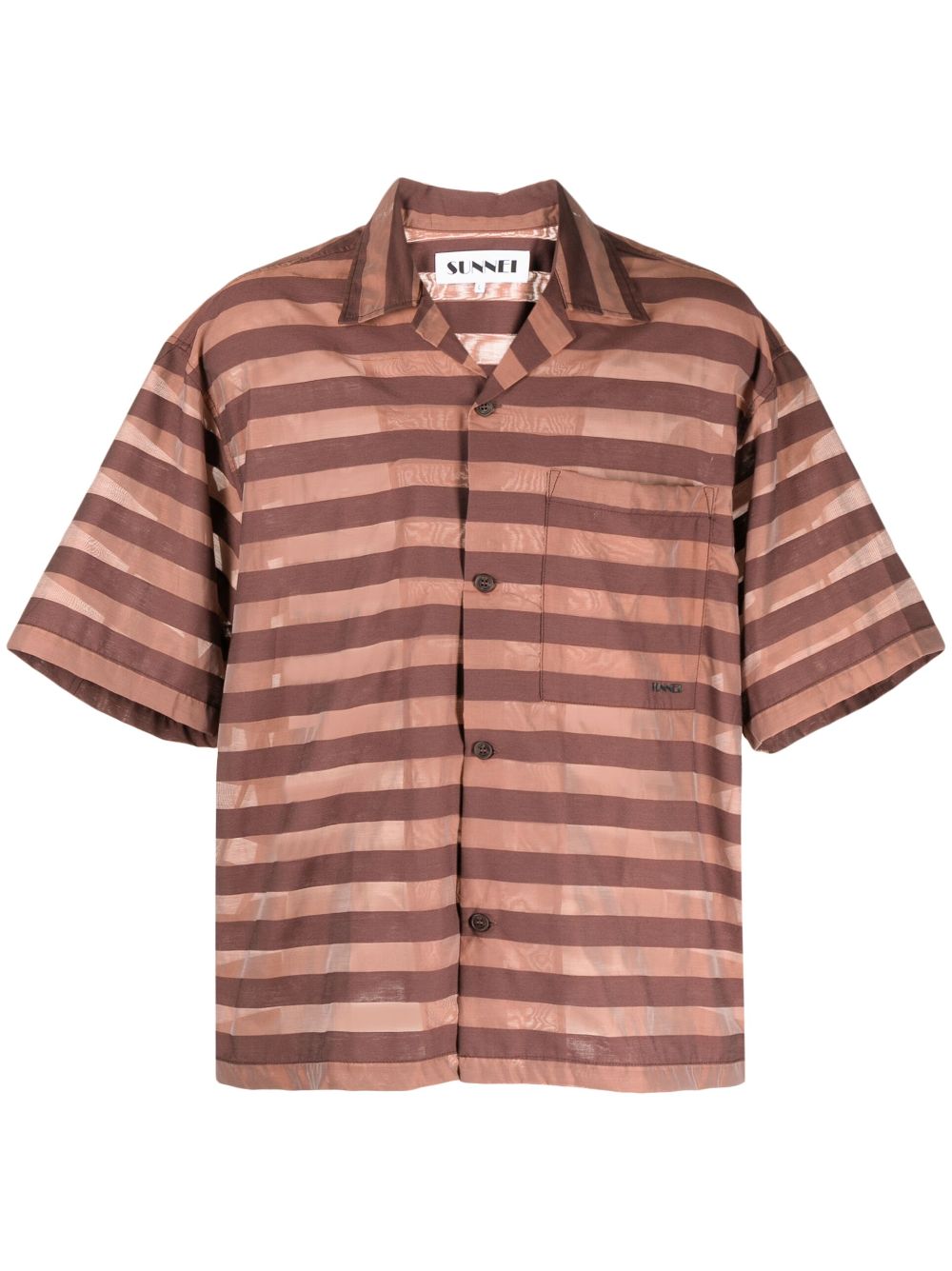 striped cotton-blend shirt from SUNNEI featuring bordeaux red, cotton blend, tonal design, horizontal stripe pattern, camp collar, front button fastening, short sleeves, chest patch pocket and straight hem.