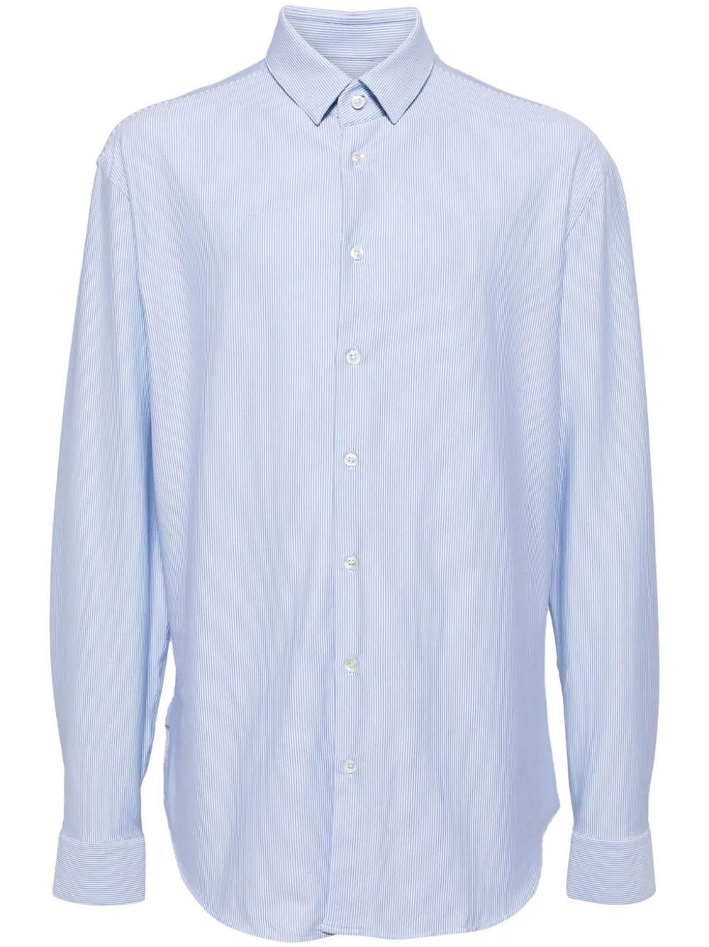 colony blue cotton blend stretch-jersey vertical stripe pattern slim fit front button fastening pointed flat collar mother-of-pearl buttons long sleeves buttoned cuffs dart detailing curved hem