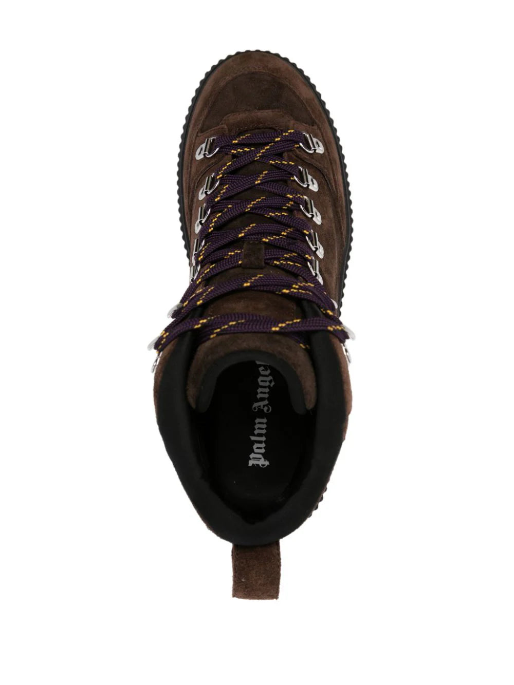 suede ankle boots from PALM ANGELS featuring brown, calf suede, logo print to the side, round toe, front lace-up fastening, logo patch at the tongue, pull-tab at the heel and flat rubber sole.