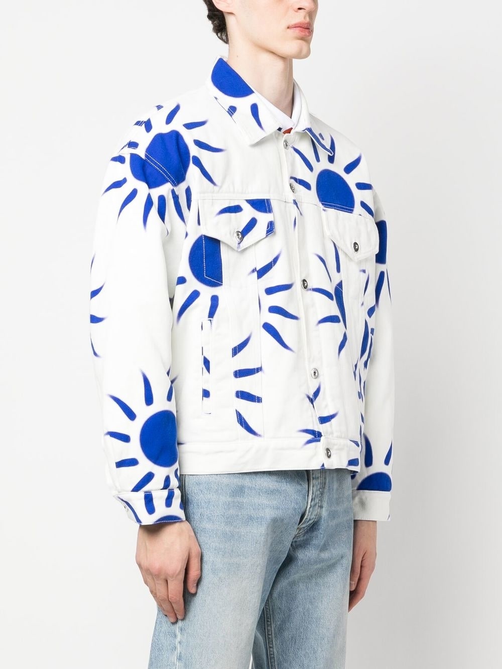 sun-print padded jacket from Liberal Youth Ministry featuring cloud white, royal blue, sun print, padded design, classic collar, front button fastening, long sleeves, two chest flap pockets, two side slit pockets and straight hem.