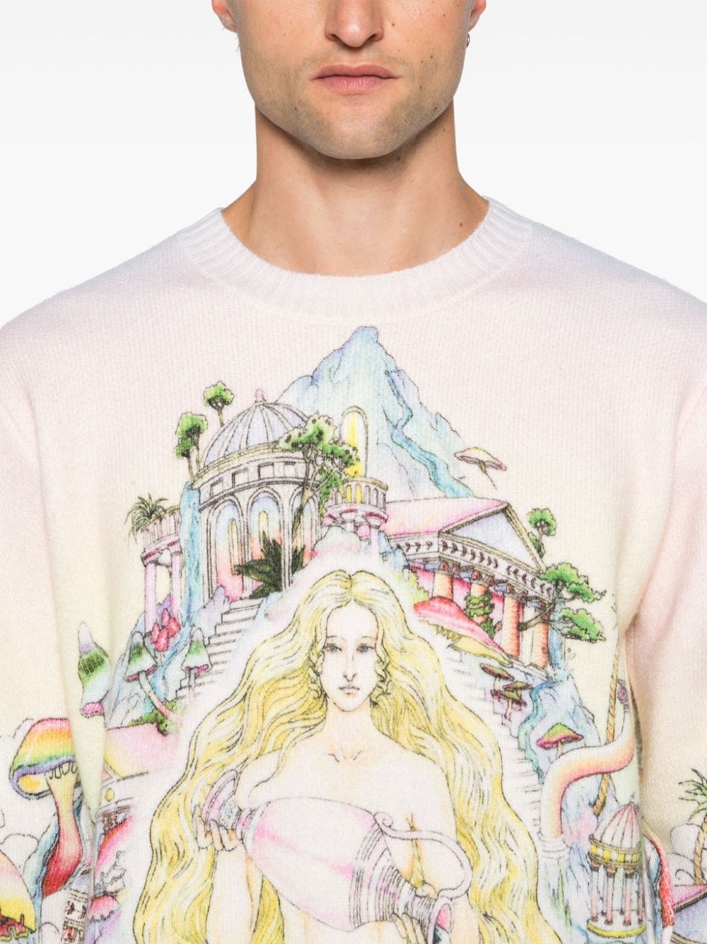 beige multicolour wool-cashmere blend fine knit The Road to Knowledge print ribbed trim crew neck long sleeves ribbed hem