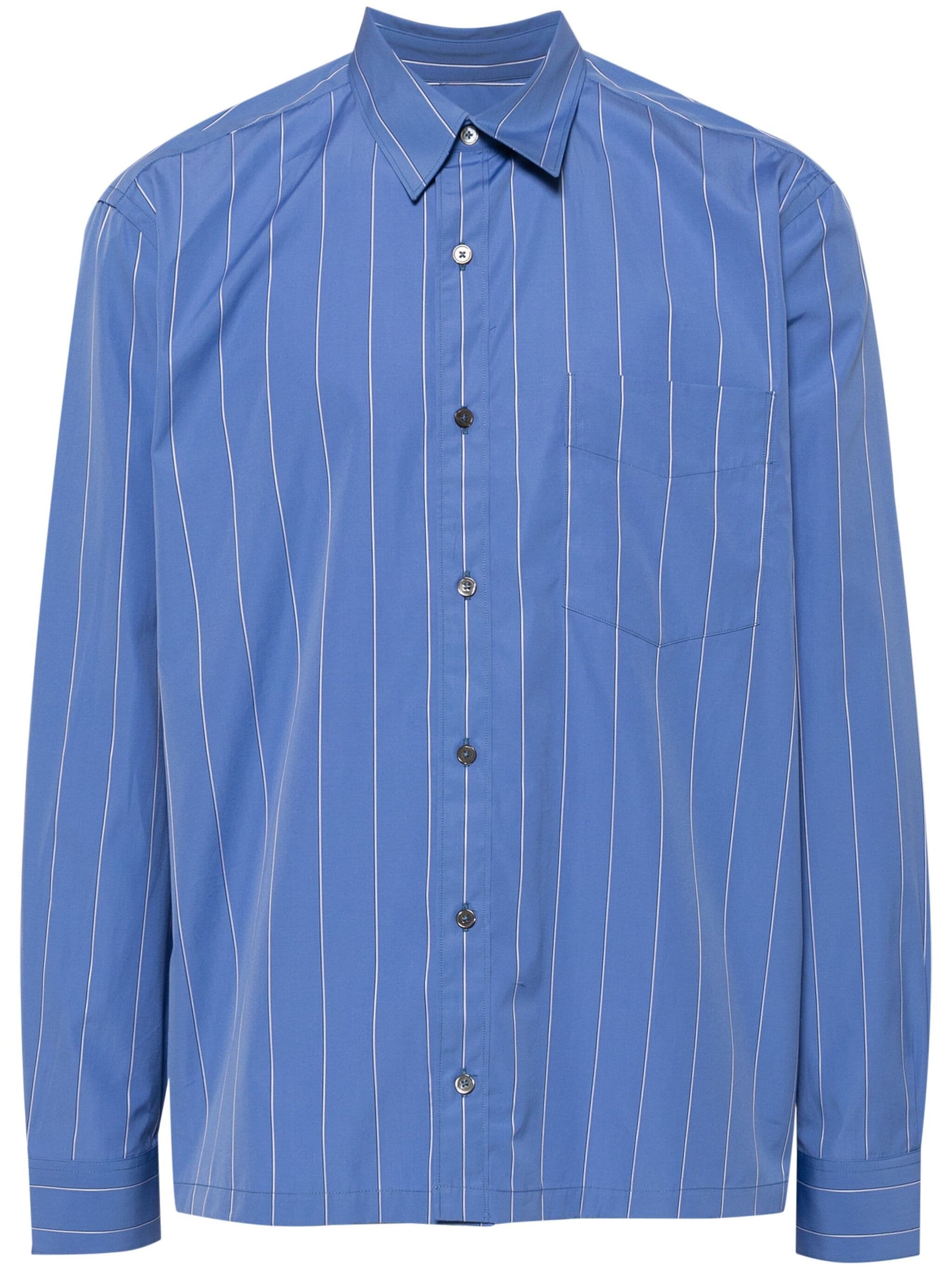 cornflower blue cotton vertical stripe pattern classic collar front button fastening long sleeves buttoned cuffs straight hem