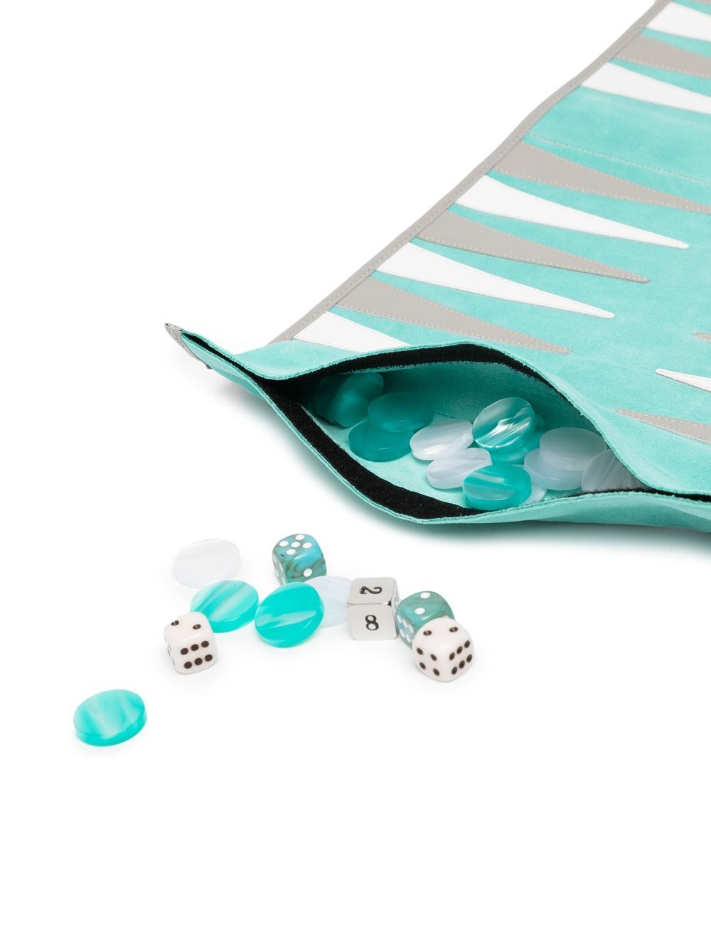 Victor travel backgammon set from Hector Saxe featuring mint green, grey, white, leather, buckle fastening and internal pocket.